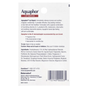 Aquaphor® Lip Repair alivia imediatamente o ressecamento e acalma os lábios rachados e rachados. Ele proporciona uma hidratação eficaz e duradoura, para que os lábios tenham uma aparência e toque mais saudáveis. Formulado com uma combinação especial de vitaminas nutritivas (C, E, pró-vitamina B5), hidratantes, manteiga de karité e essência calmante de camomila, Aquaphor deixa os lábios macios e confortáveis.