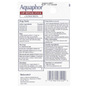 Encontre uma hidratação de longa duração e proteja seus lábios dos raios solares com o Reparador Labial da Aquaphor® em Bastão com Protetor Solar da marca de cuidados com os lábios mais recomendada por dermatologistas. O Espectro Amplo com FPS 30 fornece proteção UVA/UVB. O reparador labial em bastão também contém vitaminas nutritivas e Manteiga de Karité. Especialmente formulado para lábios sensíveis e muito secos, este bálsamo labial acalma e alivia imediatamente o ressecamento, para que os lábios fiquem com aparência e sensação mais saudáveis. O Reparador Labial da Aquaphor® em Bastão com FPS 30 hidrata e desliza facilmente pelos lábios. Por isso, também é ótimo para usar em condições secas, frias ou com vento.