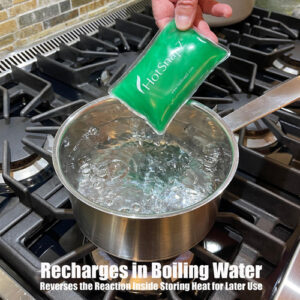 Este conjunto inclui 6 aquecedores de bolso reutilizáveis HotSnapz. (5" x 3") Quão quente fica um pacote térmico HotSnapz? A química dentro do HotSnapz é uma reação segura e autorreguladora. A temperatura interna máxima atinge 128-130F e normalmente 115-120F na superfície durante o uso normal. As temperaturas em que o HotSnapz opera são consideradas sem combustão quando usadas conforme as instruções. O que está dentro de um pacote HotSnapz e como ele funciona? Os aquecedores de mãos instantâneos reutilizáveis HotSnapz e os pacotes de calor instantâneos contêm água, um pequeno disco de metal e acetato de sódio, um ingrediente salino seguro de qualidade alimentar. O clique de um disco dentro da almofada desencadeia a precipitação dos cristais de acetato de sódio. Quando os cristais precipitam, ele libera a energia necessária para dissolvê-lo inicialmente e armazená-lo na bolsa. A liberação de energia eleva a temperatura para uma temperatura máxima de 130F (54C). O processo é teoricamente repetível indefinidamente. HotSnapz é um aquecedor de mãos com acetato de sódio. O conteúdo do HotSnapz é seguro? Sim. O conteúdo de cada HotSnapz é seguro, não tóxico e não perigoso. (Água e acetato de sódio) – CALOR INSTANTÂNEO SEM ELETRICIDADE – O encaixe interno começa a gerar calor instantâneo, atingindo até 130 graus. A reação química interna gera calor duradouro (cerca de 50 a 60 minutos). Aqueça rapidamente quando precisar. – QUALIDADE – Todos os produtos HotSnapz vêm com garantia vitalícia. Venda on-line desde 2003. – Aquecedores de mãos REUTILIZÁVEIS – Pare de encher aterros sanitários com aquecedores de mãos descartáveis! Recarregue fervendo seu HotSnapz em água por 10 a 15 minutos. Retire e deixe esfriar até a temperatura ambiente. Eles estão então prontos para serem usados repetidamente. – SURPREENDA SEUS AMIGOS E FAMILIARES – Quando você os vê ou os mostra pela primeira vez a alguém, você saberá o que queremos dizer. Eles têm o efeito “WOW”. – GARANTIA VITALÍCIA