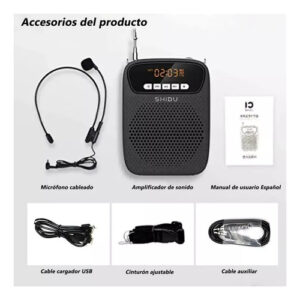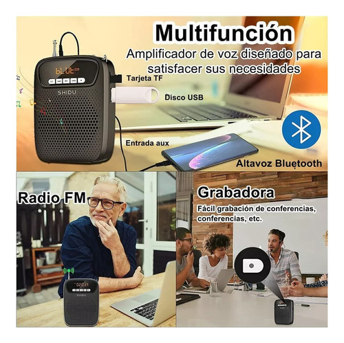Este amplificador de voz puede actuar como un altavoz portátil transmitiendo música a través de Bluetooth al dispositivo o utilizando el puerto auxiliar. También es compatible con la reproducción de tarjetas TF, la reproducción de unidades flash USB y la radio FM. Grabación de una tecla, solo necesita insertar una tarjeta TF/SD y un micrófono con cable para grabar. ¡No volverás a perderte ningún mensaje importante!