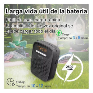 El amplificador de voz portátil recargable proporciona hasta 12 horas de funcionamiento con una batería completamente cargada. Y solo tarda de 3 a 5 horas en cargarse por completo.