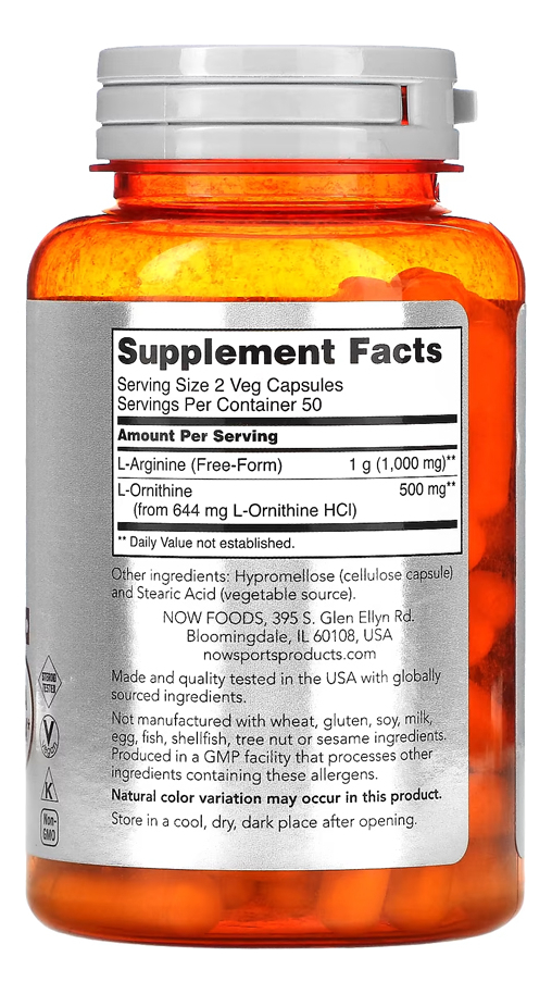 Arginina e Ornitina 500/250mg Now Foods 100Cáp Produto Importado