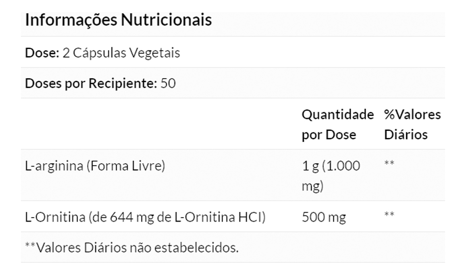 5. Composição do Produto: Cada cápsula contém 500mg de Arginina e 250mg de Ornitina, uma combinação sinérgica que oferece suporte nutricional. A formulação é desenvolvida para garantir a eficácia do produto, sem aditivos ou substâncias desnecessárias. Validade longa