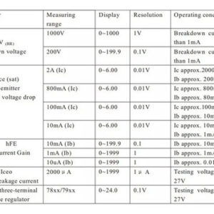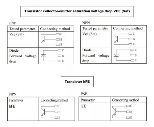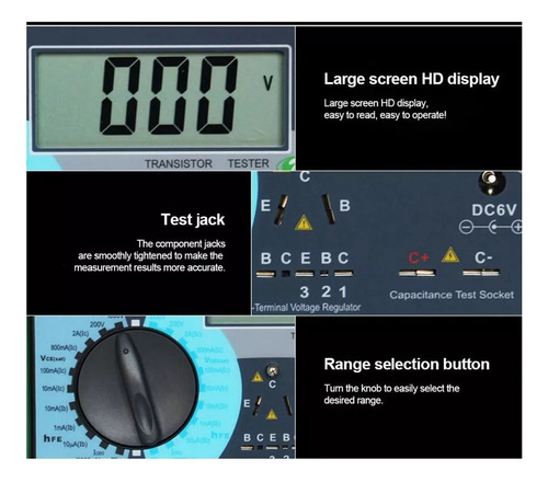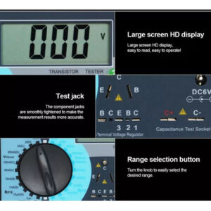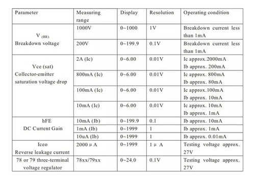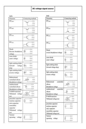 Medindo tensão direta, tensão reversa, queda de tensão de saturação direta, fator de amplificação, corrente de fuga reversa de diodo de cristal, audion, retificador controlado por silício (), transistor de efeito de campo (FET). Medição da tensão nominal de trabalho do capacitor químico, capacitor de cerâmica multicamada com chumbo, lacre de alta tensão. Medindo a tensão de trabalho do capacitor químico, capacitor DY294 Ta, capacitor cerâmico multicamada com chumbo, lacre de alta tensão. Medindo a tensão de trabalho do capacitor químico, capacitor de cerâmica multicamada com chumbo Cor do varistor: conforme mostrado