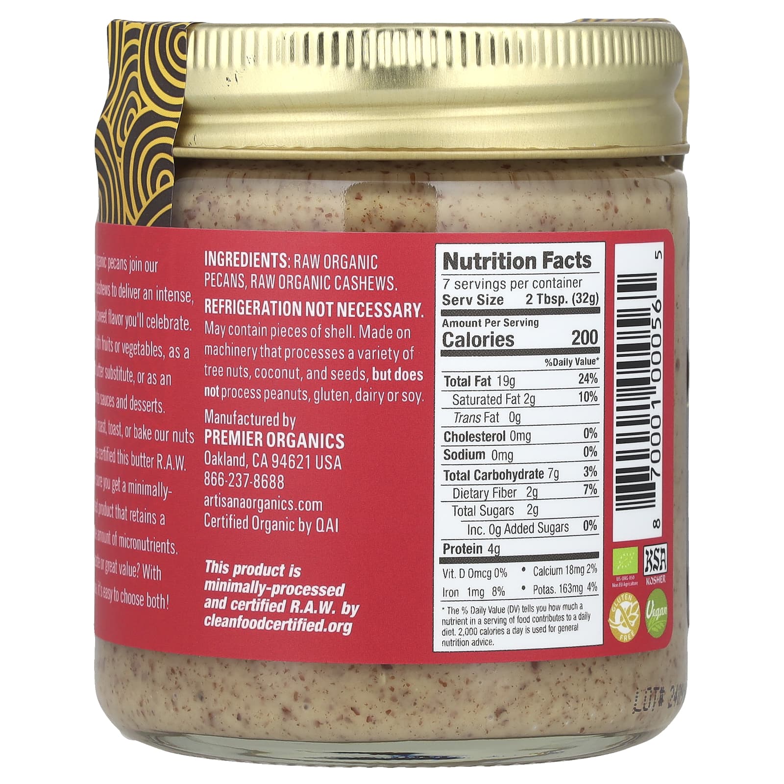Produzido em máquinas que também processam uma variedade de frutos secos, coco, e sementes, mas não processam amendoim, glúten, laticínios ou soja.