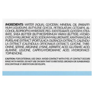 Água, glicerina, óleo mineral (Paraffinum liquidum), butilenoglicol, petrolato, álcool cetoestearílico, miristato de isopropila, estearato de PEG-100, monoestearato de glicerila, manteiga de karité (manteiga de Butyrospermum parkii), ácido hialurônico hidrolisado, hialuronato de sódio, goma xantana, extrato de beldroega (extrato de Portulaca oleracea), extrato de calêndula (extrato de Calendula officinalis), glicina, treonina, serina, arginina, lisina, ácido aspártico, ácido glutâmico, alanina, leucina, caprylhydroxamic acid, hydroxyacetophenone.