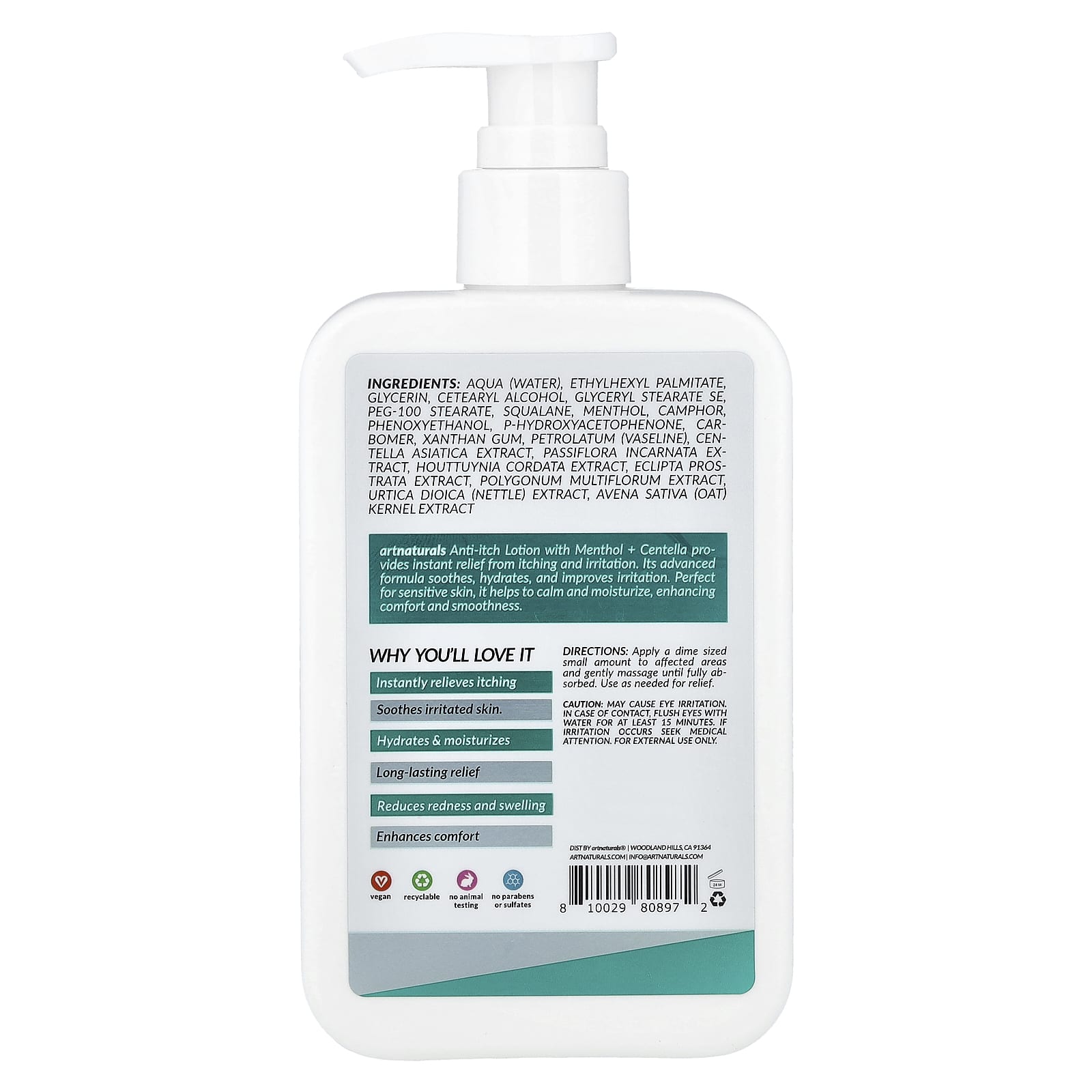 A Loção Anticoceira com Mentol + Centella da artnaturals proporciona alívio instantâneo para a coceira e a irritação. Sua fórmula avançada acalma, hidrata e melhora a irritação. Perfeito para peles sensíveis, ele ajuda a acalmar e hidratar, aumentando o conforto e a suavidade.