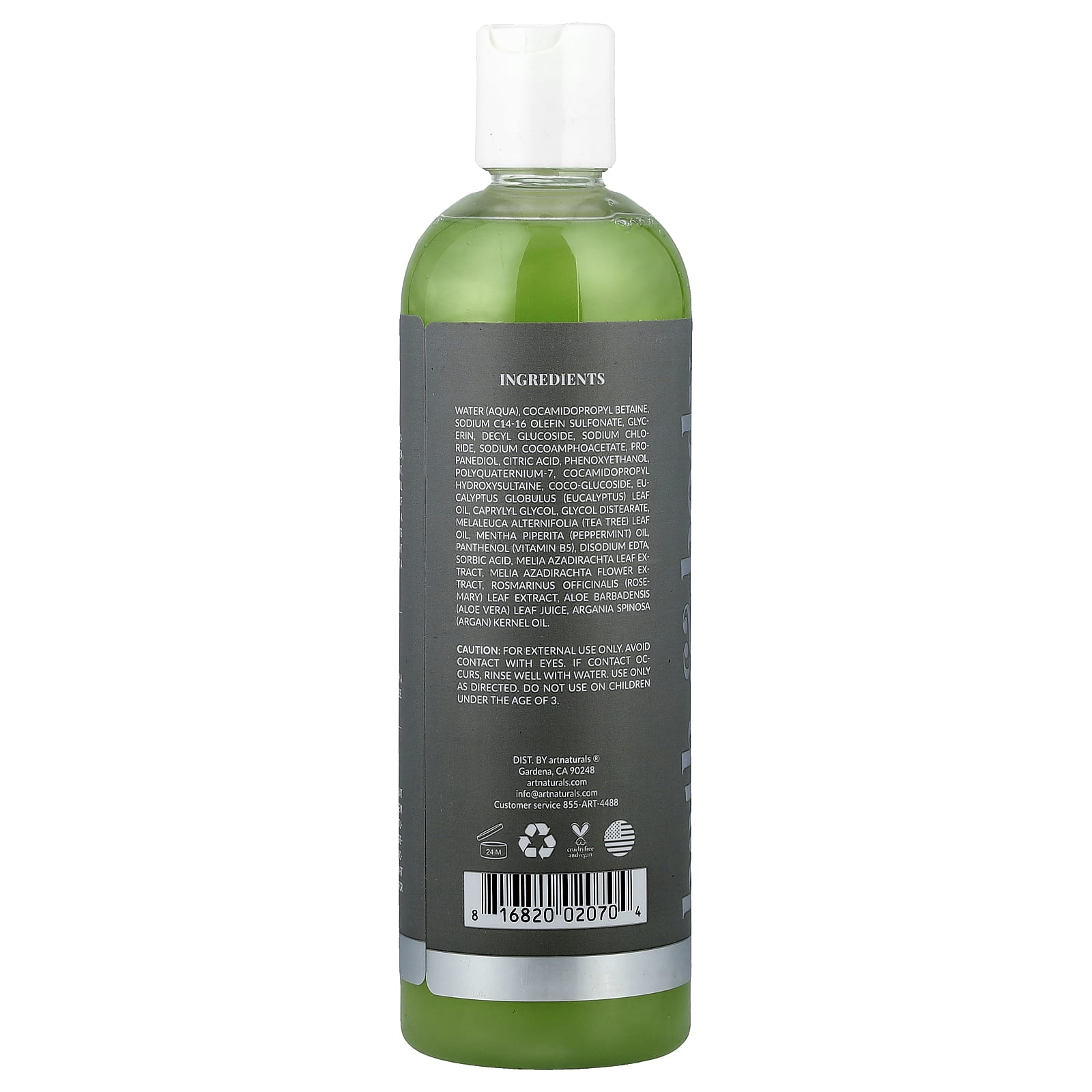 Água, cocoamidopropilbetaína, sodium C14-16 olefin sulfonate, glicerina, decyl glucoside, cloreto de sódio, cocoanfoacetato de sódio, propanediol, ácido cítrico, fenoxietanol poliquatérnio-7, cocamidopropyl hydroxysultaine, coco-glucoside, óleo da folha de Eucalyptus globulus (eucalipto), caprylyl glycol, diestearato de etilenoglicol, óleo da folha de Melaleuca alternifolia (melaleuca), óleo de Mentha piperita (hortelã-pimenta), pantenol (vitamina B5), edetato dissódico, ácido sórbico, extrato da folha de Melia azadirachta, extrato da flor de Melia azadirachta, extrato da folha de Rosmarinus officinalis (alecrim), suco da folha de Aloe barbadensis (babosa), óleo da semente de Argania spinosa (argão).