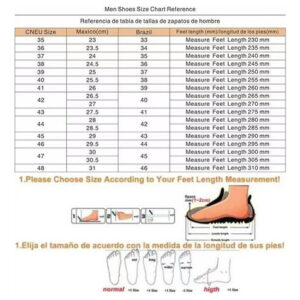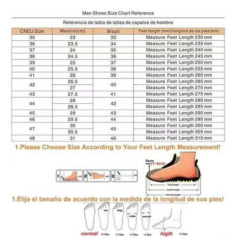 Somos tamanho padrão europeu, escolha o tamanho apropriado do comprimento dos pés se você confundir com o tamanho: se seus pés forem mais grossos ou mais selvagens, escolha um tamanho maior