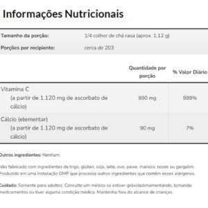 5. Elementos da Composição: Formulado com Ascorbato de Cálcio de alta qualidade, este produto oferece uma fonte concentrada de vitamina C, essencial para fortalecer o sistema imunológico. Validade longa