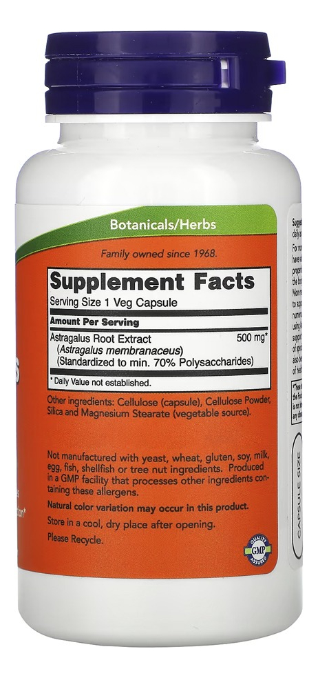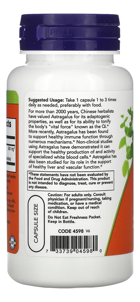 Herbalistas chineses valorizaram o Astragalus por suas propriedades de tonificar o Qi. Apoia a função imunológica Astragalus também foi estudado quanto ao seu papel na função vascular. Outros ingredientes: celulose (cápsula), celulose em pó, sílica e estearato de magnésio (fonte vegetal). Não contém fermento, trigo, glúten, soja, leite, ovo, peixe, marisco ou ingredientes de nozes. Produzido em uma instalação de GMP que processa outros ingredientes contendo esses alérgenos. Cuidado: apenas para adultos. Consulte um médico se estiver grávida / amamentando, ou se tiver um problema. VALIDADE LONGA.