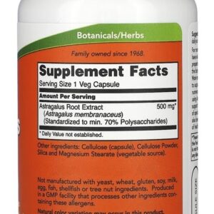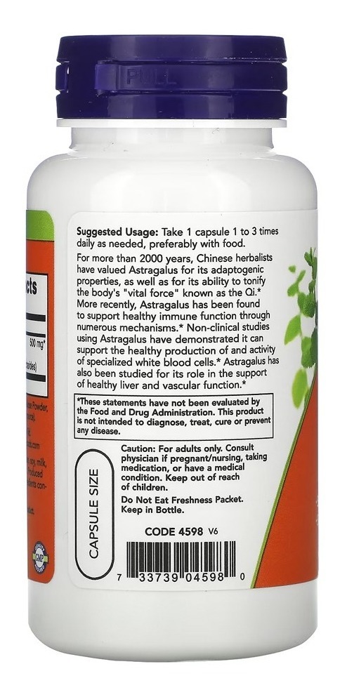 Astragalus Erva Chinesa 500mg Now Foods 90Vcaps Herbalistas chineses valorizaram o Astragalus por suas propriedades de tonificar o Qi. Apoia a função imunológica Astragalus também foi estudado quanto ao seu papel na função vascular. Outros ingredientes: celulose (cápsula), celulose em pó, sílica e estearato de magnésio (fonte vegetal). Não contém fermento, trigo, glúten, soja, leite, ovo, peixe, marisco ou ingredientes de nozes. Produzido em uma instalação de GMP que processa outros ingredientes contendo esses alérgenos. Cuidado: apenas para adultos. Consulte um médico se estiver grávida / amamentando, ou se tiver um problema. .