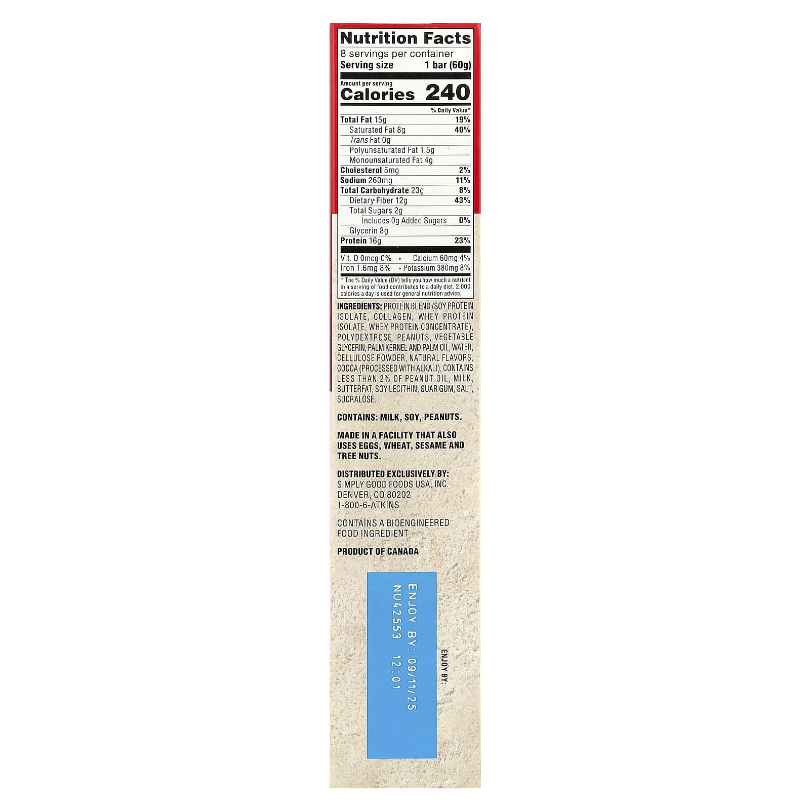 Mistura de proteínas (isolado de proteína de soja, gelatina, isolado de proteína de soro de leite, concentrado de proteína de soro de leite), polidextrose, amendoim, glicerina vegetal, palmiste e óleo de palma, sabor natural, água, pó de cacau em pó (processado com álcali), contém menos de 2 % de: óleo de amendoim, gordura butírica, lecitina de soja, azeite, leite, sal, goma guar, sucralose.
