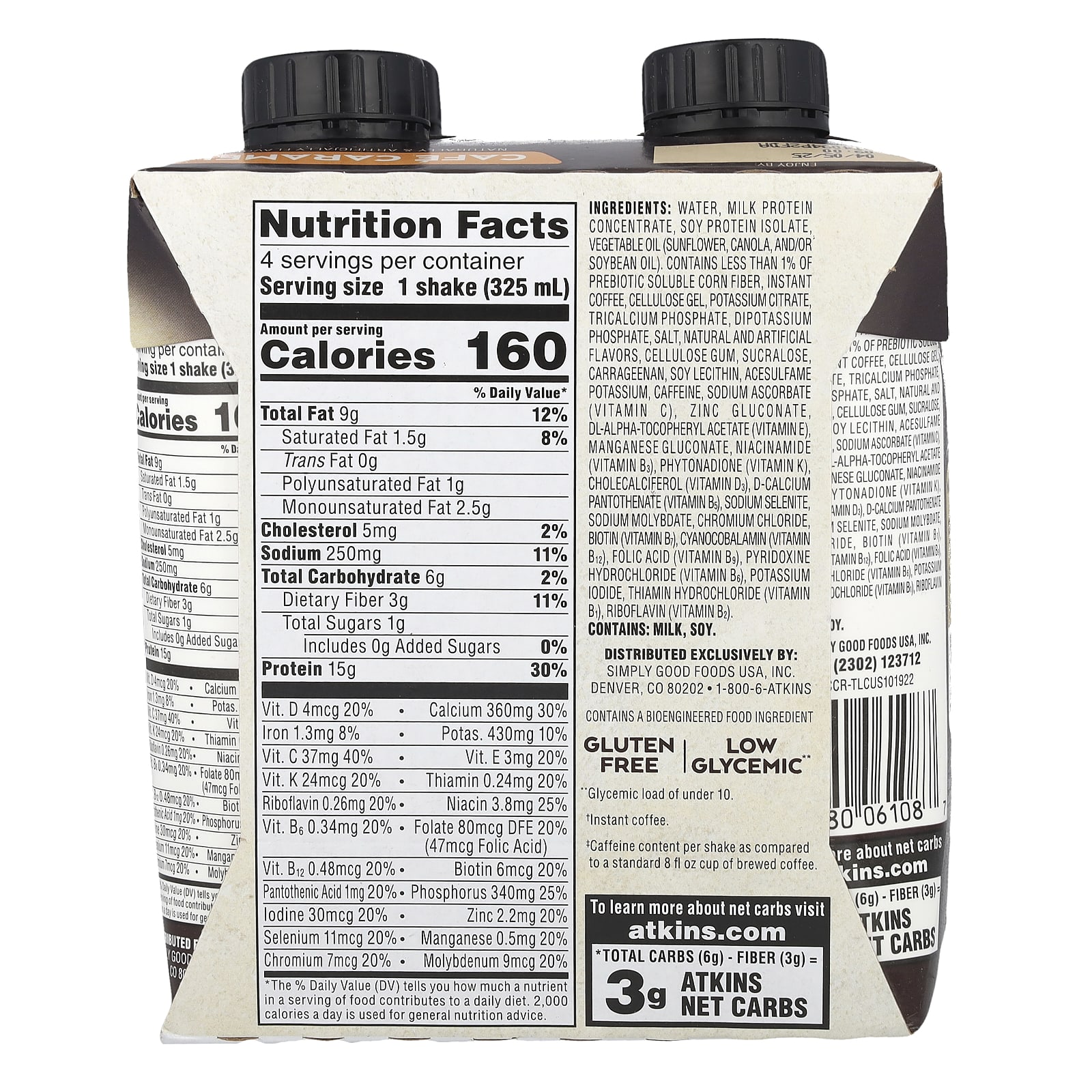 Água, concentrado proteico de leite, óleo vegetal de isolado proteico de soja (girassol, canola, e/ou óleo de soja). contém menos de 1% de fibra de milho prebiótica solúvel, café instantâneo, gel de celulose, citrato de potássio, tricalcium phosphate, fosfato de potássio dibásico, sal, sabores naturais e artificiais, goma de celulose, sucralose, carragenina, lecitina de soja, acessulfamo potássico, cafeína, ascorbato de sódio (vitamina C), gliconato de zinco, acetato de racealfatocoferol (vitamina E) gliconato de manganês, nicotinamida (vitamina B3), fitomenadiona (vitamina K), colecalciferol (vitamina D3), pantotenato de cálcio (vitamina B5), selenito de sódio, molibdato de sódio, cloreto de cromo, biotina (vitamina B7), cianocobalamina (vitamina B12), ácido fólico (vitamina B9), cloridrato de piridoxina (vitamina B6), iodeto de potássio, cloridrato de tiamina (vitamina B1), riboflavina (vitamina B2).