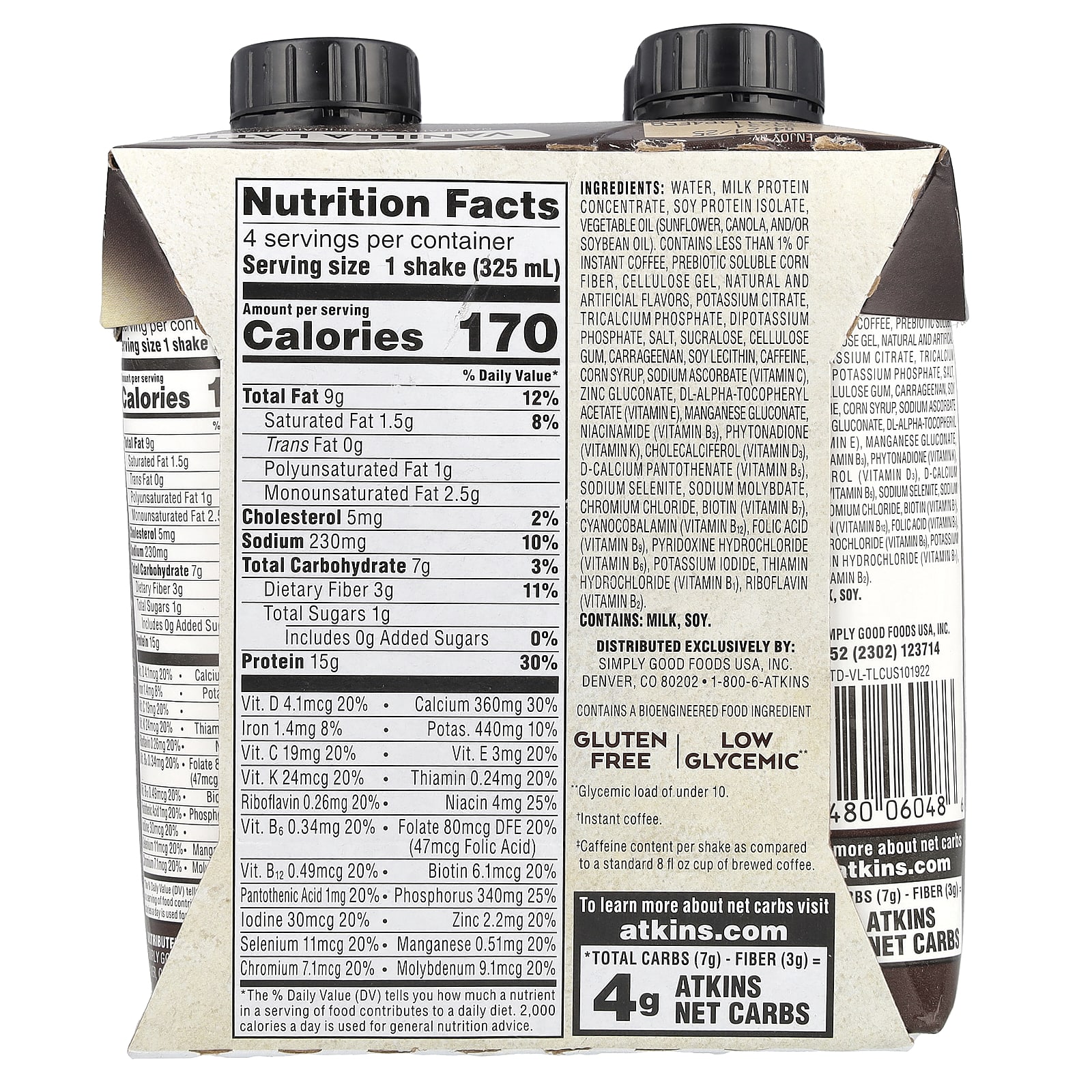 Água, concentrado proteico de leite, isolado proteico de soja, óleo vegetal (girassol, canola, e/ou óleo de soja). Contém menos de 1% de café instantâneo, fibra de milho solúvel prebiótica, gel de celulose, sabores naturais e artificiais, citrato de potássio, tricalcium phosphate, fosfato de potássio dibásico, sal, sucralose, goma de celulose, carragenina, lecitina de soja, cafeína, xarope de milho, ascorbato de sódio (vitamina C), gliconato de zinco, acetato de racealfatocoferol (vitamina E), gliconato de manganês, nicotinamida (vitamina B3), fitomenadiona (vitamina K), colecalciferol (vitamina D3), pantotenato de cálcio (vitamina B5), selenito de sódio, molibdato de sódio, cloreto de cromo, biotina (vitamina B7), cianocobalamina (vitamina B12), ácido fólico (vitamina B9), cloridrato de piridoxina (vitamina B6), iodeto de potássio, cloridrato de tiamina (vitamina B1), riboflavina (vitamina B2).