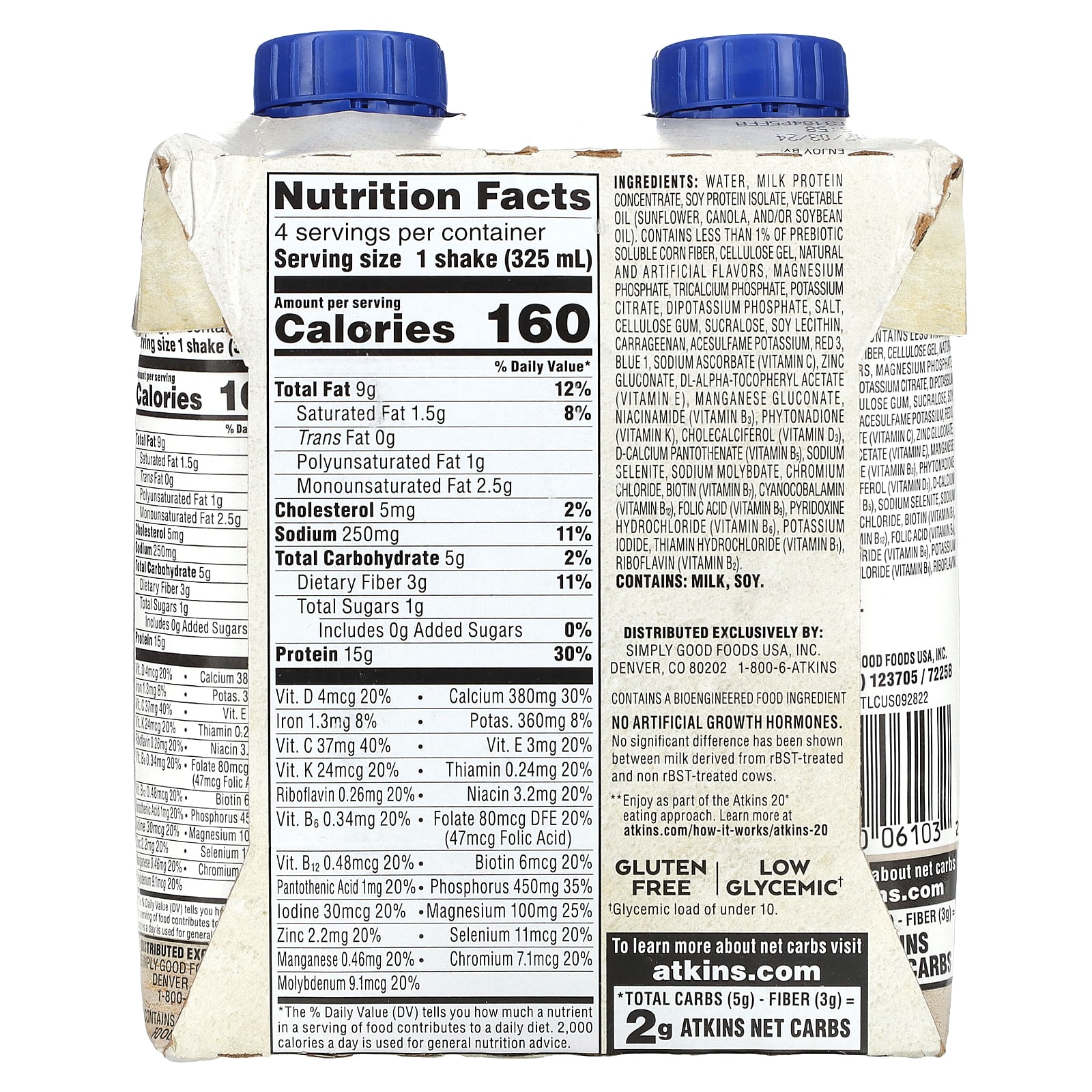 Água, concentrado proteico de leite, isolado proteico de soja, óleo vegetal (girassol, canola, e/ou óleo de soja). contém menos de 1% de fibra de milho prebiótica solúvel, gel de celulose, sabores naturais e artificiais, fosfato de magnésio, tricalcium phosphate, citrato de potássio, fosfato de potássio dibásico, sal, goma de celulose, sucralose, lecitina de soja, carragenina, acessulfamo potássico, vermelho 3, azul brilhante, ascorbato de sódio (vitamina C), gliconato de zinco, acetato de racealfatocoferol (vitamina E), nicotinamida de gliconato de manganês (vitamina B3), fitomenadiona (vitamina K), colecalciferol (vitamina D3), pantotenato de cálcio (vitamina B5), selenito de sódio, molibdato de sódio, cloreto de cromo, biotina (vitamina B7), cianocobalamina (vitamina B12), ácido fólico (vitamina B9), cloridrato de piridoxina (vitamina B6), iodeto de potássio, cloridrato de tiamina (vitamina B1), riboflavina (vitamina B2).