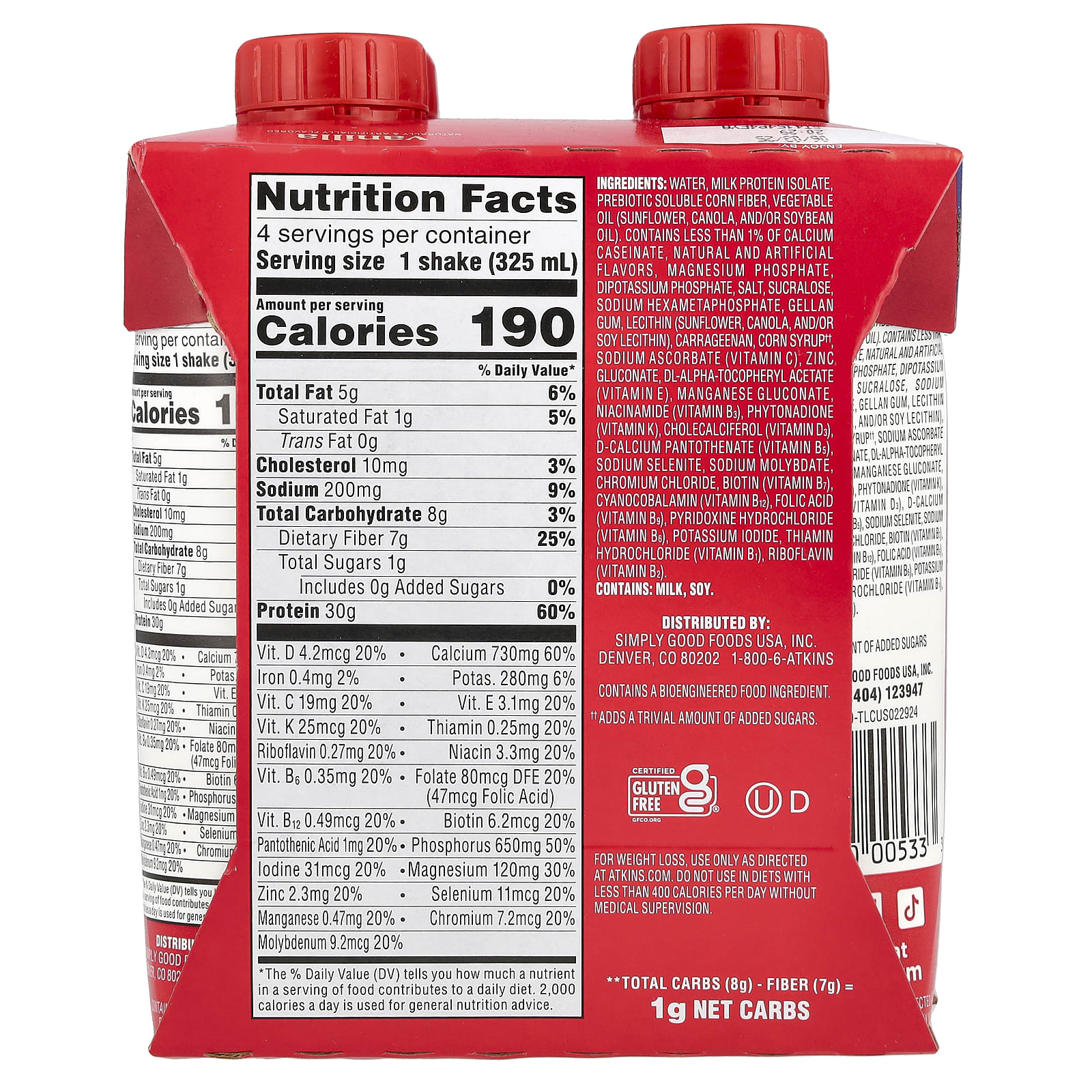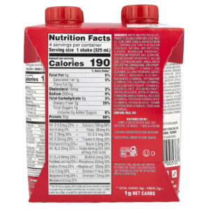 Água, isolado de proteína de leite, fibra de milho solúvel prebiótica, óleo vegetal (girassol, canola, e/ou óleo de soja), contém menos de 1% de caseinato de cálcio, sabores naturais e artificiais, fosfato de magnésio, fosfato de potássio dibásico, sal, sucralose, hexametafosfato de sódio, goma gelana, lecitina (girassol, canola, e/ou lecitina de soja), carragenina, xarope de milho††, ascorbato de sódio (vitamina C), gliconato de zinco, acetato de racealfatocoferol (vitamina E), gliconato de manganês, nicotinamida (vitamina B3), fitomenadiona (vitamina K), colecalciferol (vitamina D3), pantotenato de cálcio (vitamina B5), selenito de sódio, molibdato de sódio, cloreto de cromo, biotina (vitamina B7), cianocobalamina (vitamina B12), ácido fólico (vitamina B9), cloridrato de piridoxina (vitamina B6), iodeto de potássio, cloridrato de tiamina (vitamina B1), riboflavina (vitamina B2).