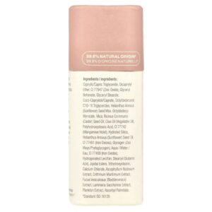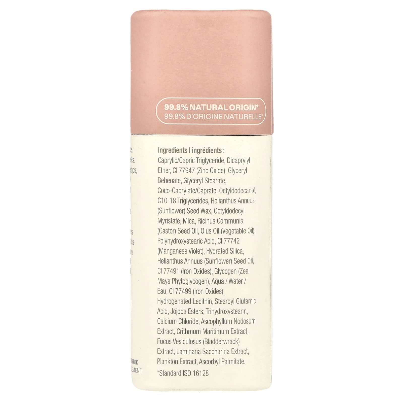 Caprylic/capric triglyceride, dicaprylyl ether, CI 77947 (óxido de zinco), beenato de glicerila, monoestearato de glicerila, coco-caprylate/caprate, octildodecanol, triglicerídeos c10-18, cera da semente de Helianthus annuus (girassol), octyldodecyl myristate, mica, óleo da semente de Ricinus communis (rícino), óleo de olus (óleo vegetal), ácido polihidroxiesteárico, CI 77742 (violeta de manganês), sílica hidratada, óleo da semente de Helianthus annuus (girassol), CI 77491 (óxidos de ferro), glicogênio (Zea mays, fitoglicogênio), aqua/água/eau, CI 77499 (óxidos de ferro), lecitina hidrogenada, ácido stearoyl glutamic, jojoba esters, trihydroxystearin, cloreto de cálcio, extrato de Ascophyllum nodosum, extrato de Crithmum maritimum, extrato de Fucus vesiculosus (bodelha), extrato de Laminaria saccharina, extrato de plâncton, palmitato de ascorbila.
