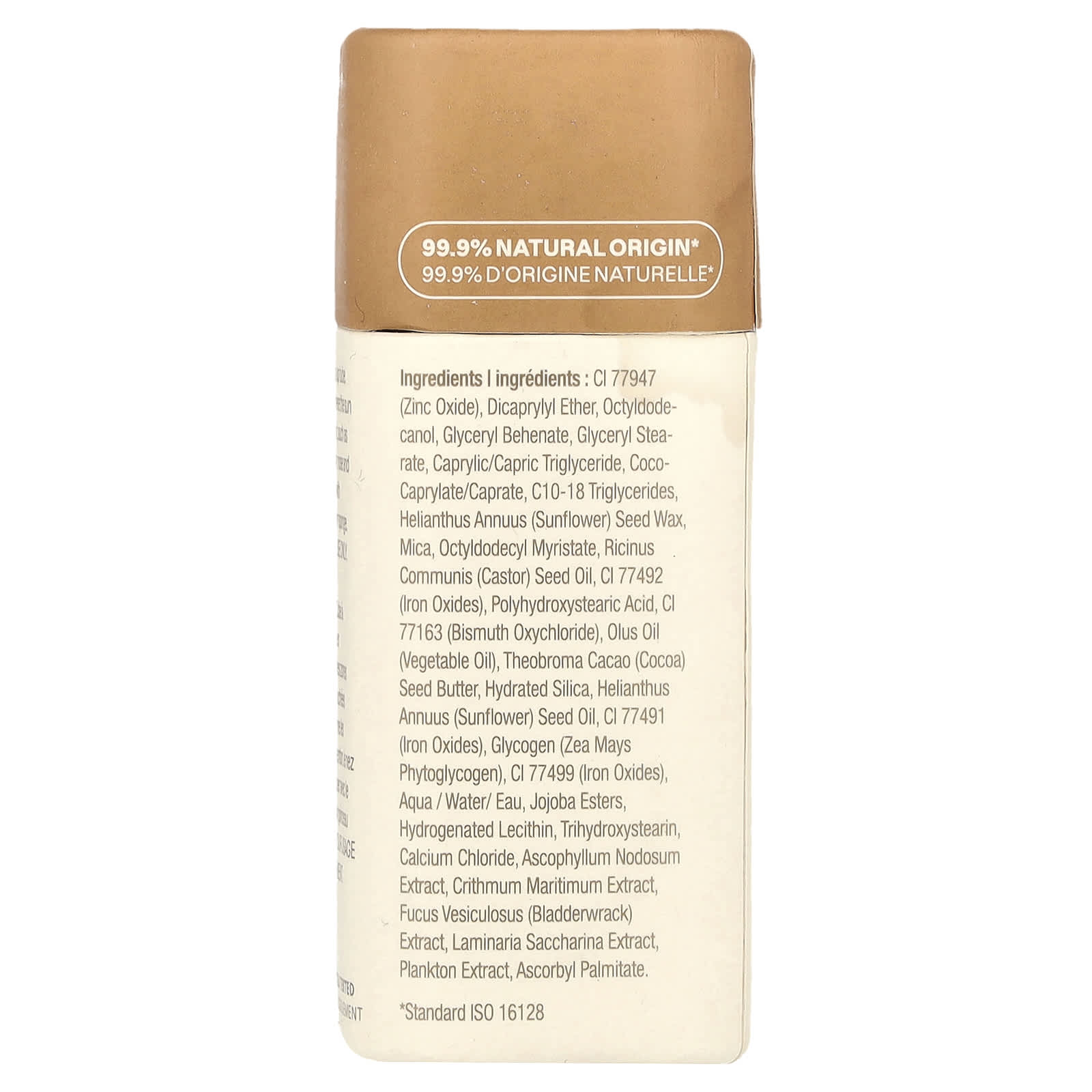 CI 77947 (óxido de zinco), dicaprylyl ether, octildodecanol, beenato de glicerila, monoestearato de glicerila, caprylic/capric triglyceride, coco-caprylate/caprate, triglicerídeos c10-18, cera da semente de Helianthus annuus (girassol), mica, octyldodecyl myristate, óleo da semente de Ricinus communis (rícino), CI 77492 (óxidos de ferro), ácido polihidroxiesteárico, CI 77163 (oxicloreto de bismuto), óleo de olus (óleo vegetal), manteiga da semente de Theobroma cacao (cacau), sílica hidratada, óleo da semente de Helianthus annuus (girassol), CI 77491 (óxidos de ferro), glicogênio (fitoglicogeno de Zea mays), CI 77499 (óxidos de ferro) aqua/água/eau, jojoba esters, lecitina hidrogenada, trihydroxystearin, cloreto de cálcio, extrato de Ascophyllum nodosum, extrato de Crithmum maritimum, extrato de Fucus vesiculosus (bodelha), extrato de Laminaria saccharina, extrato de plâncton, palmitato de ascorbila.