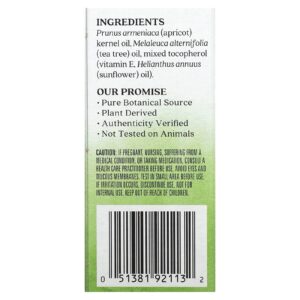 Óleo da semente de Prunus armeniaca (damasco), óleo de Melaleuca alternifolia (melaleuca), tocoferol misto (vitamina E, óleo de Helianthus annuus (girassol).