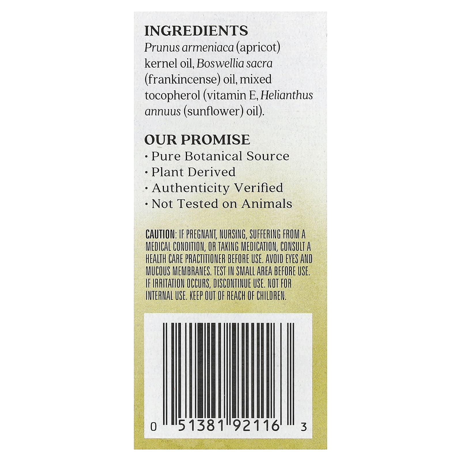 Óleo da semente de Prunus armeniaca (damasco), óleo de boswellia sacra (olíbano), tocoferol (vitamina E)