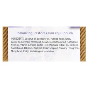 Óleo de coco, óleo de girassol, água purificada, álcali, óleo de rícino, composto de lavanda, óleo de gergelim, óleo de Hidnocarpus (cacto), óleo de neem, vitamina E, óleo da árvore de manteiga indiana (Madhuca indica), cúrcuma, sândalo, hibisco, folha de bael, indian soapnut, zedoária, fenacho, feijão mungo, índigo e Alangium salvifolium.