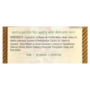 Óleo de coco, óleo de girassol, água purificada, álcali, óleo de rícino, composto de baunilha, óleo de gergelim, óleo de Hidnocarpus (cacto), óleo de neem, vitamina E, óleo de faia indiana, óleo de groselha indiana (amla), sândalo, hibisco, hena, vetiver, zedoária, fenacho, feijão mungo, pétalas de rosa e índigo.
