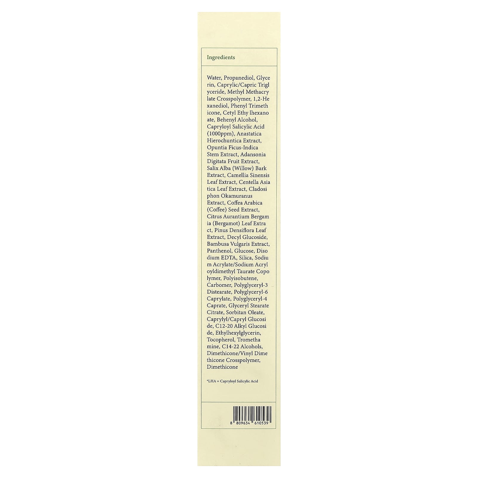 Água, propanodiol, Glicerina, triglicerídeo caprílico/cáprico, polímero cruzado de metacrilato de metila, 1,2-hexanodiol, fenil trimeticona, etilcaproato de cetila, behenyl alcohol, capryloyl salicylic acid (1.000 ppm), extrato de Anastatica hierochuntica, extrato do caule de Opuntia ficus-indica, extrato da fruta de Adansonia digitata, extrato da casca de Salix alba (salgueiro), Extrato de folha de Camellia sinensis, extrato de folha de centella asiatica, extrato de Cladosi phon okamuranus, extrato da semente de Coffea arabica (cafe), extrato da folha de Citrus aurantium bergamia (bergamota), extrato da folha de Pinus densiflora, decil glicosídeo, extrato de Bambusa vulgaris, pantenol, glicose, EDTA dissódico, sílica, sodium acrylate/sodium acryloyldimethyl taurate copolymer, em poliisobuteno, carbômero, diestearato de poliglicerila-3, polyglyceryl-6 caprylate, polyglyceryl-4 caprate, citrato de monoestearato de glicerila, oleato de sorbitana, caprylyl/capryl glucoside, c12-20 alkyl glucoside, etilhexilglicerina, Tocoferol, Trometamina, álcoois c14-22, dimethicone/vinyl, crospolímero de dimethicone, dimeticona