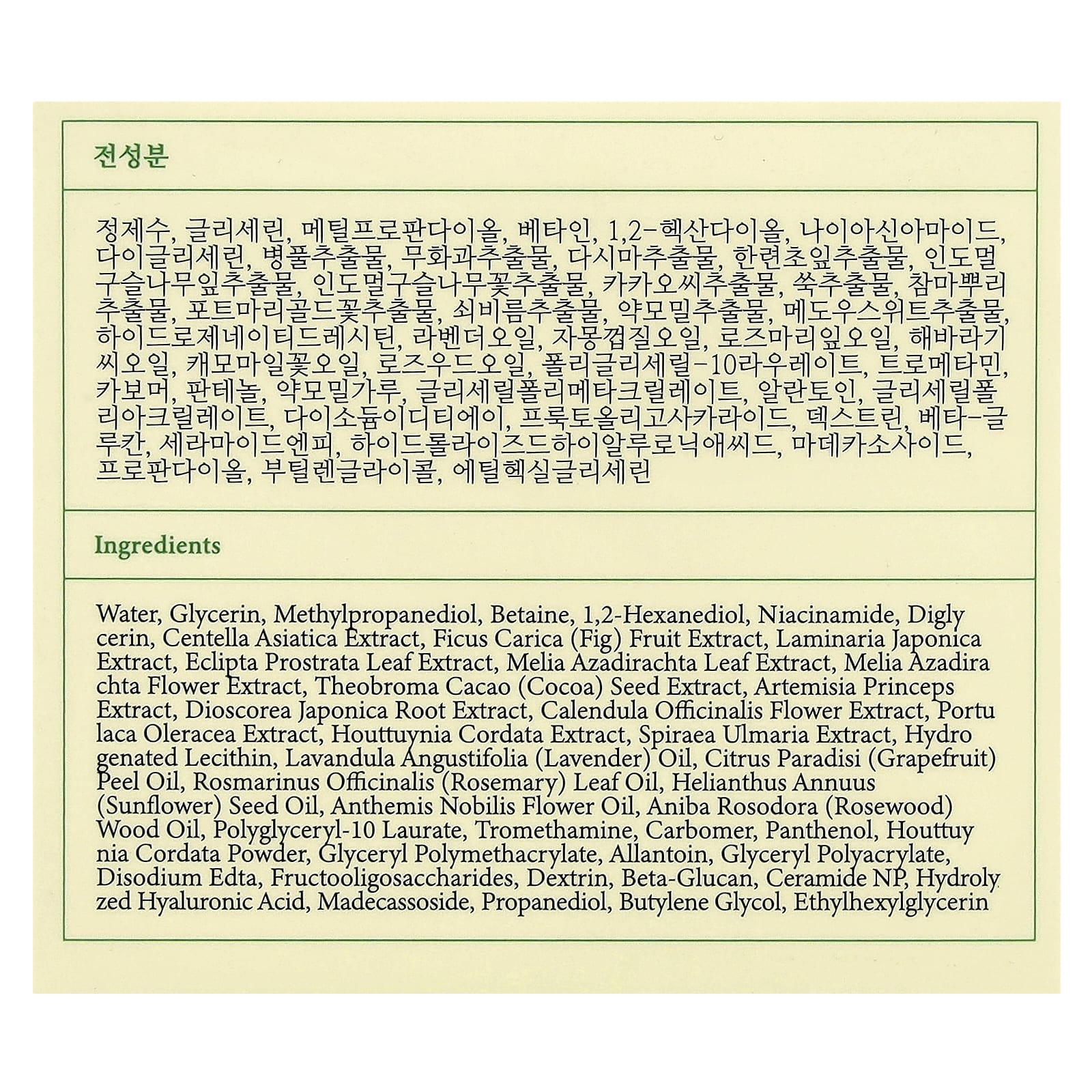 Água, glicerina, methylpropanediol, betaína, 1,2-hexanediol, nicotinamida, diacilglicerol, extrato de Centella asiatica, extrato da fruta de Ficus carica (figo), extrato de Laminaria japonica, extrato da folha de Eclipta prostrata, extrato da folha de Melia azadirachta, extrato da flor de Melia azadirachta, extrato da semente de Theobroma cacao (cacau), extrato de Artemisia princeps, extrato da raiz de Discorea japonica, extrato da flor de Calendula officinalis, extrato de Portulaca oleracea, extrato de Houttuynia cordata, extrato de spiraea ulmaria, lecitina hidrogenada, óleo de Lavandula angustifolia (lavanda), óleo da casca de Citrus paradisi (toranja rosa), óleo da folha de Rosmarinus officinalis (alecrim), óleo da semente de Helianthus annuus (girassol), óleo da flor de Anthemis nobilis, óleo de madeira de Aniba rosodora (pau-rosa), polyglyceryl-10 laurate, trometamol, carbômero, pantenol, Houttuynia cordata em pó, glyceryl polymethacrylate, alantoína, glyceryl polyacrylate, edetato dissódico, fruto-oligossacarídeos, dextrina, betaglucano, ceramida NP, ácido hialurônico hidrolisado, madecassoside, propanediol, butilenoglicol, ethylhexylglycerin.