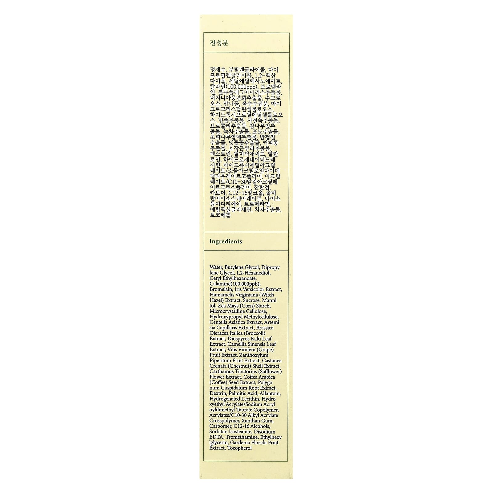 Água, butilenoglicol, dipropilenoglicol, 1,2-hexanediol, etilcaproato de cetila, calamina (100.000 ppb), bromelaína, extrato de Iris versicolor, extrato de Hamamelis virginiana (hamamélis), sacarose, Manni tol, amido de Zea mays (milho), celulose microcristalina, hidroxipropilmetilcelulose, extrato de Centella asiatica, extrato de Artemi sia capillaris, extrato de Brassica oleracea italica (brócolis), extrato da folha de Diospyros kaki, extrato da folha de Camellia sinensis, extrato da fruta de Vitis vinifera (uva), extrato da fruta de Zanthoxylum piperitum, extrato da casca de Castanhas crenata (castanha), extrato da flor de Carthamus tinctorius (cártamo), extrato da semente de Coffea arabica (café), extrato da raiz de Polygonum cuspidatum, dextrina, ácido palmítico, alantoína, lecitina hidrogenada, Copolímero de acriloildimetiltaurato de sódio e acrilato de hidroxietil, acrylates/c10-30 alkyl acrylate crosspolymer, goma xantana, carbômero, c12-16 alcohols, isoestearato de sorbitana, edetato dissódico, trometamol, ethylhexylglycerin, extrato da fruta de Gardenia florida, tocoferol.