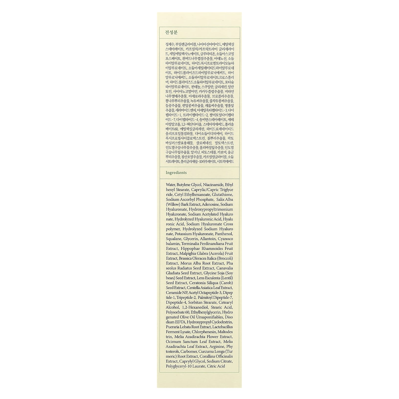 Água, butylene glycol, nicotinamida, estearato de octila, caprylic/capric triglyceride, etilcaproato de cetila, glutationa, sodium ascorbyl phosphate, extrato da casca de Salix alba (salgueiro), adenosina, hialuronato de sódio, hydroxypropyltrimonium hyaluronate, sodium acetylated hyaluronate, ácido hialurônico hidrolisado, ácido hialurônico, polímero cruzado de hialuronato de sódio, hialuronato de sódio hidrolisado, hialuronato de potássio, pantenol, esqualano, glicerina, alantoína, cianocobalamina, extrato da fruta de Terminalia ferdinandiana, extrato da fruta de Hippophae rhamnoides, extrato da fruta de Malpighia glabra (acerola), extrato de Brassica oleracea italica (brócolis), extrato da raiz de Morus alba, extrato da semente de Phaseolus radiatus, extrato da semente de Canavalia Gladiata, extrato da semente de Glycine soja (soja), extrato da semente de Lens esculenta (lentilha), extrato da semente de Ceratonia siliqua (alfarroba), extrato da folha de Centella asiatica, ceramida NP, acetil octapeptídeo-3, dipeptídeo-1, tripeptídeo-2, palmitoil dipeptídeo-7, dipeptídeo-4, estearato de sorbitana, álcool cetoestearílico, 1,2-hexanediol, ácido esteárico, polissorbato 60, ethylhexylglycerin, insaponificáveis de óleo de oliva hidrogenado, edetato dissódico, hidroxipropilbetaciclodextrina, extrato da raiz de Pueraria lobata, lisado do fermento de lactobacilos, clorfenesina, maltodextrina, extrato da flor de Melia azadirachta, extrato da folha de Ocimum sanctum, extrato da folha de Melia azadirachta, arginina, fitoesteróis, carbômero, extrato da raiz de Curcuma longa (cúrcuma), extrato de Corallina officinalis, caprylyl glycol, citrato de sódio, polyglyceryl-10 laurate, ácido cítrico.
