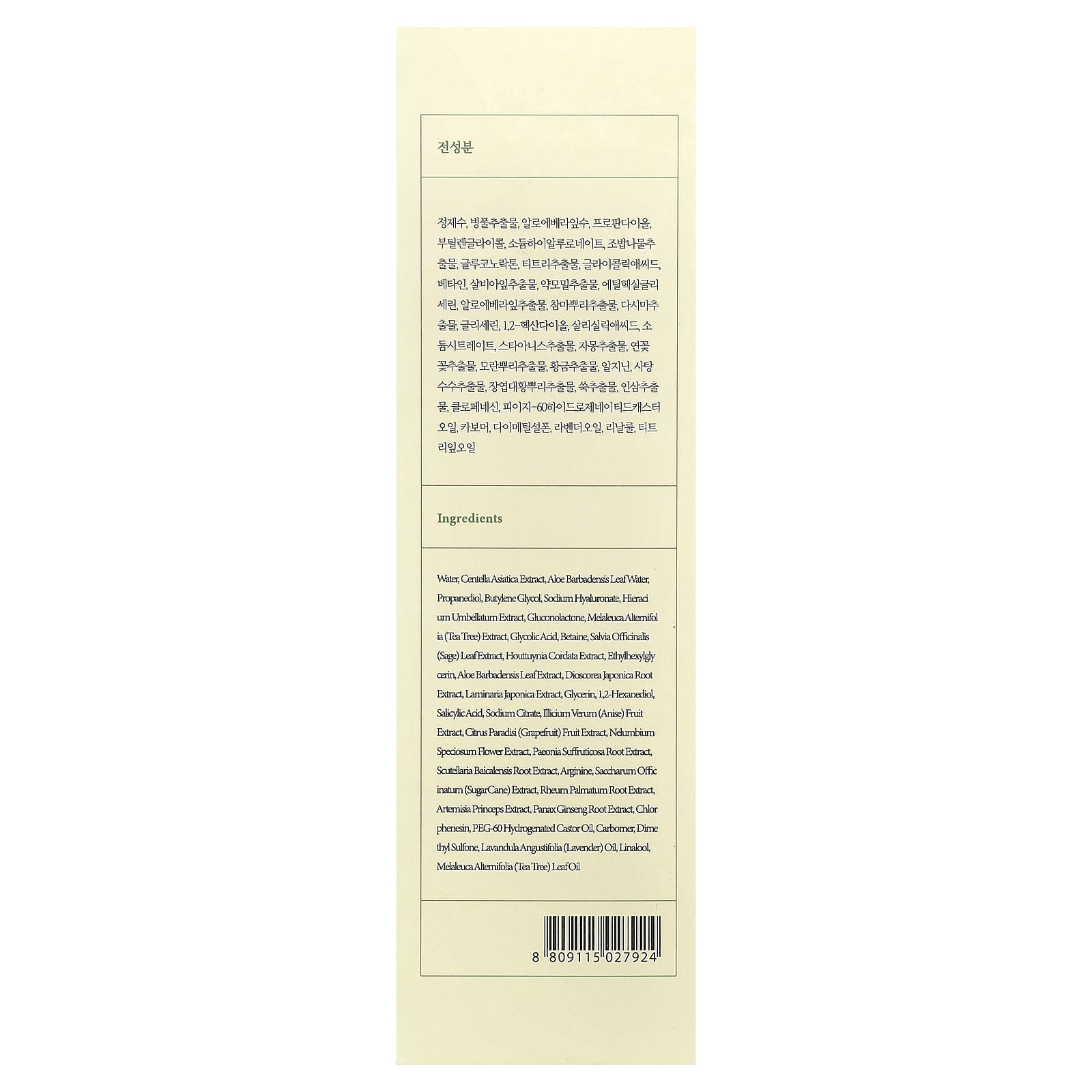 água, extrato de Centella asiatica, água da folha de Aloe barbadensis, propanediol, butilenoglicol, hialuronato de sódio, extrato de Hieracium umbellatum, gluconolactone, extrato de Melaleuca alternifolia (melaleuca), ácido glicólico, betaína, extrato da folha de Salvia officinalis (sálvia), extrato de Houttuynia cordata, ethylhexylglycerin, extrato da folha de Aloe barbadensis, extrato da raiz de Discorea japonica, extrato de Laminaria japonica, glicerina, 1,2-hexanediol, ácido salicílico, citrato de sódio, extrato da fruta de Illicium verum (anis), extrato da fruta de Citrus paradisi (toranja rosa), extrato da flor de Nelumbium speciosum, extrato de raiz de Paeonia suffruticosa, extrato da raiz de Scutellaria baicalensis, arginina, extrato de Saccharum officinarum (cana-de-açúcar), extrato da raiz de Rheum palmatum, extrato de Artemisia princeps, extrato de raiz de Panax ginseng, clorfenesina, óleo de rícino hidrogenado peg-60, carbômero, dimetilsulfona, óleo de Lavandula angustifolia (lavanda), linalol, óleo da folha de Melaleuca alternifolia (melaleuca).