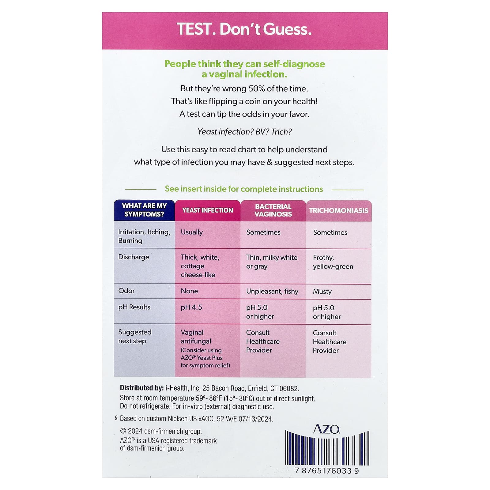 | Próximo passo sugerido | Antifúngico vaginal (considere o uso de Levedura Plus da AZO® para alívio dos sintomas) | Consulte um Profissional de Saúde | Consulte um Profissional de Saúde |