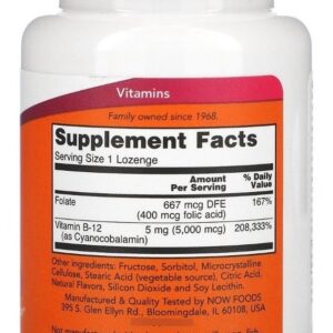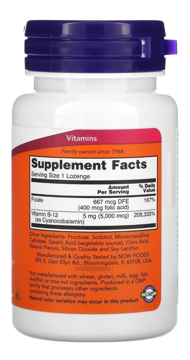 Now Foods Vitamina B12 5000mcg e Ácido Fólico 60 Pastilhas Suporte a Produção de Energia no Metabolismo. A Vitamina B12 e o Ácido Fólico são compostos importantes para o bom funcionamento do corpo. Com essa fórmula combinada da Now Foods, é possível contar com os benefícios da vitamina B12, um composto solúvel importante para a produção de energia a partir de gorduras e proteínas, e do Ácido Fólico, uma substância que desempenha um papel importante na conversão de homocisteína em metionina e no apoio ao desempenho das articulações cardiovasculares. A vitamina B12 também é essencial para a síntese de DNA durante a divisão celular.