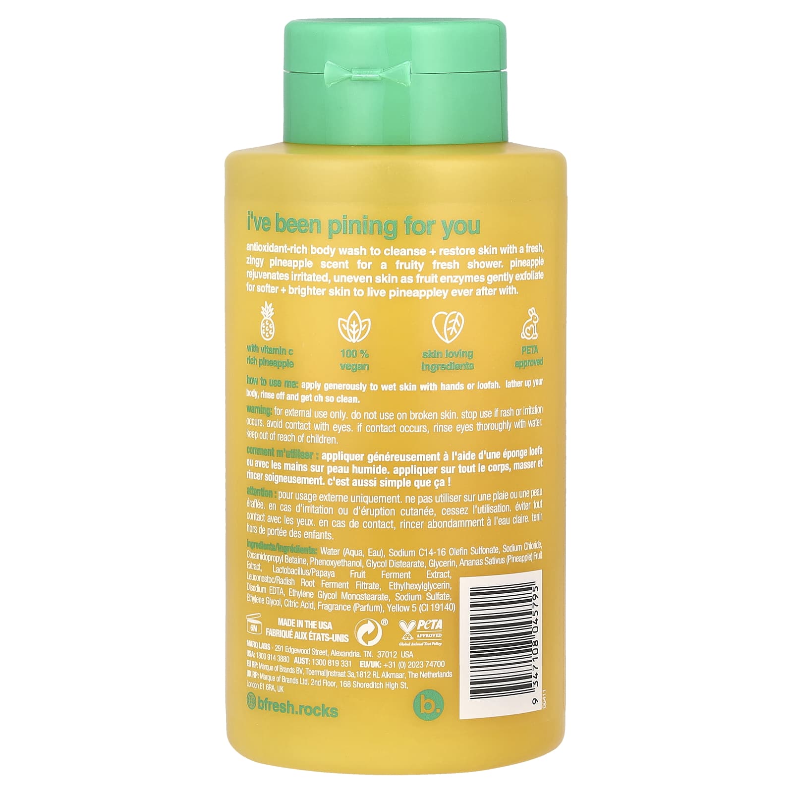 Water (aqua, eau), sodium c14-16 olefin sulfonate, sodium chloride, cocamidopropyl betaine, phenoxyethanol, glycol distearate, glycerin, ananas sativus (pineapple) fruit extract, lactobacillus/papaya leuconostoc/radish root ferment filtrate, ethylhexylglycerin, fruit ferment extract, disodium edta, ethylene glycol monostearate, sodium sulfate, ethylene glycol, citric acid, fragrance (parfum), yellow 5 (ci 19140).
