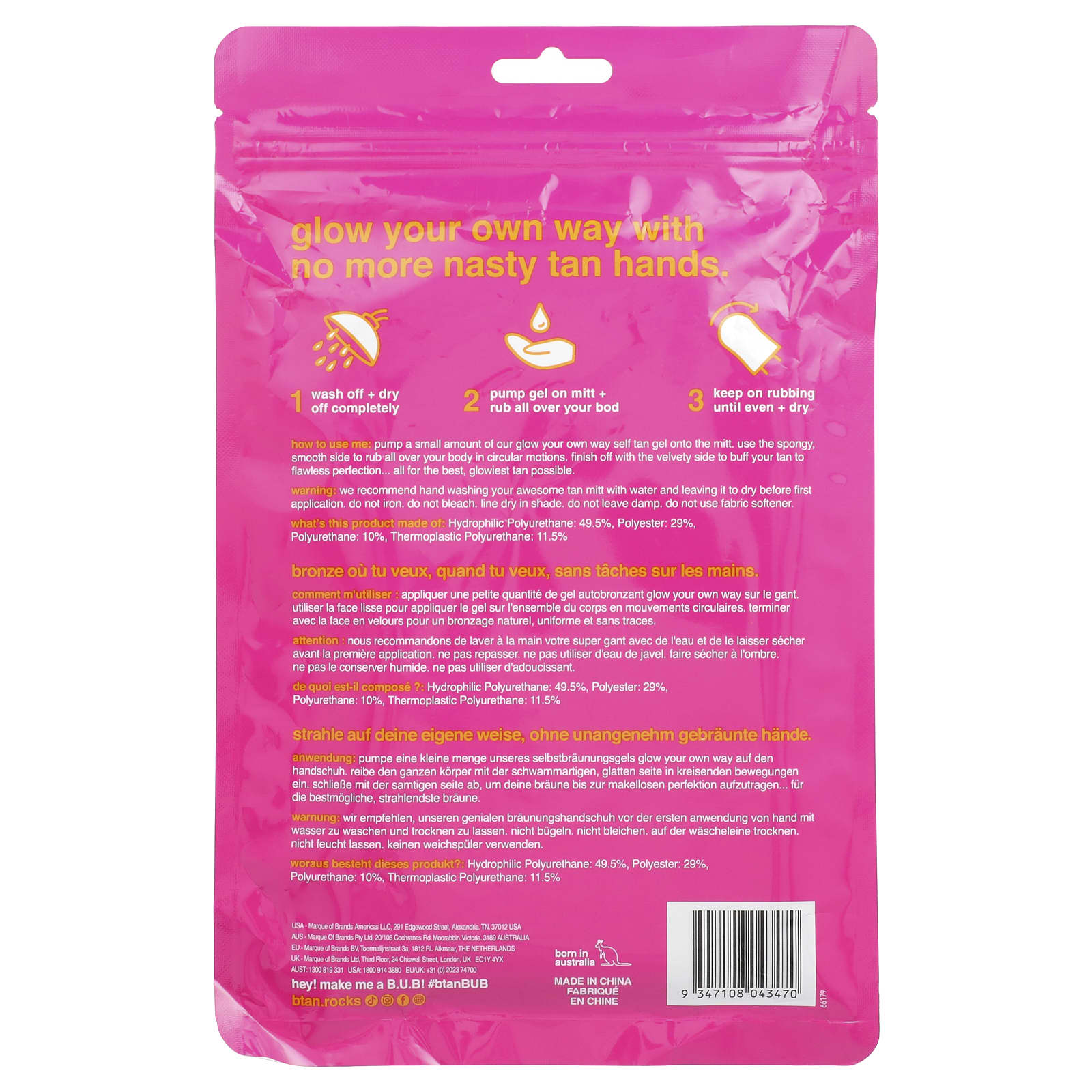 Aperte a luva para aplicar uma pequena quantidade do nosso gel de autobronzeamento que brilhe à sua maneira. Use o lado esponjoso e liso para esfregar em todo o corpo, fazendo movimentos circulares. Termine com o lado aveludado para polir seu bronzeado até a perfeição perfeita… tudo para o melhor e mais brilhante bronzeado possível.