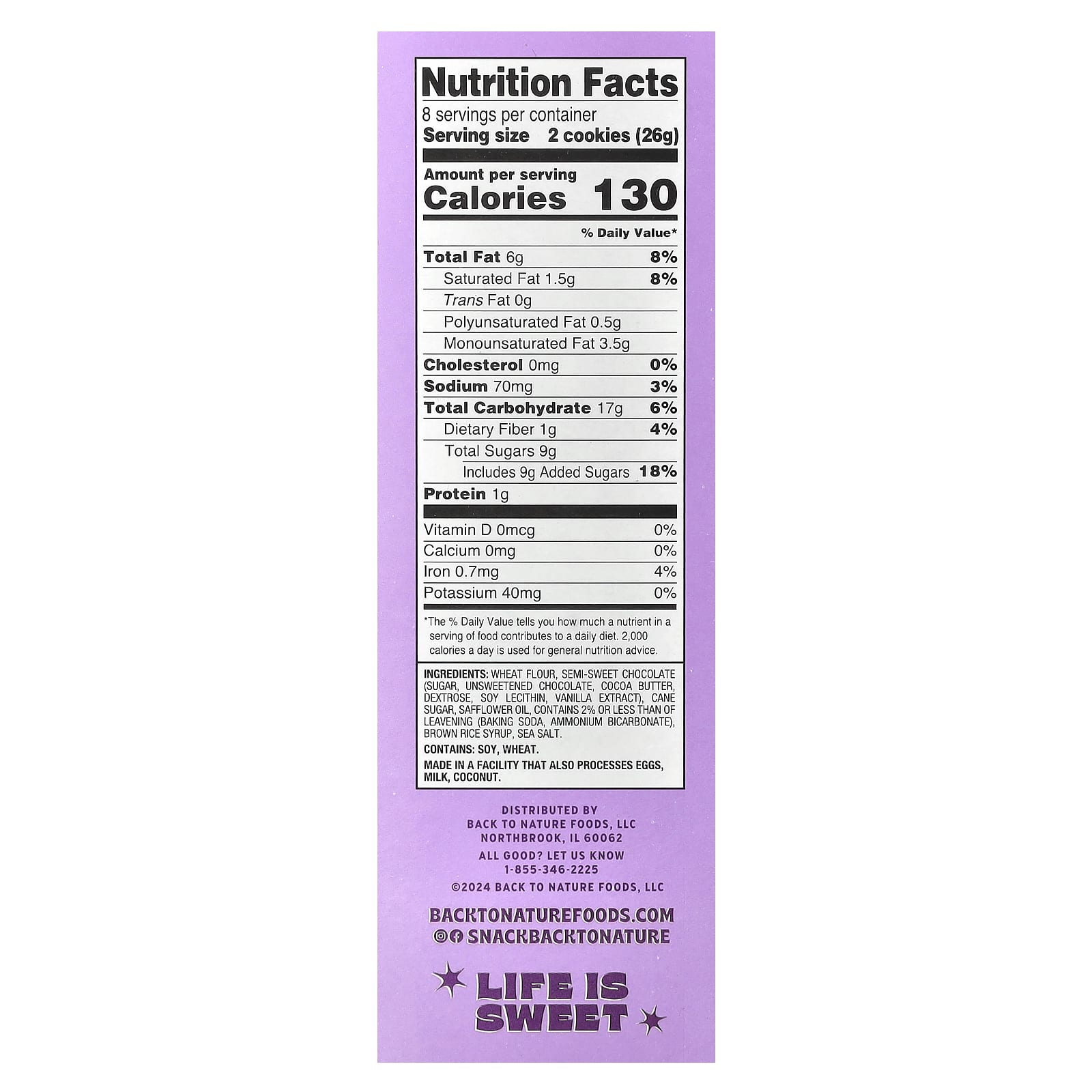 Farinha de trigo, açúcar de chocolate semidoce, chocolate não adoçado, manteiga de cacau, dextrose, lecitina de soja, extrato de baunilha), açúcar de cana-de-açúcar, óleo de cártamo, contém 2% ou menos de fermentação (bicarbonato de sódio, bicarbonato de amônio), xarope de arroz integral, sal marinho.