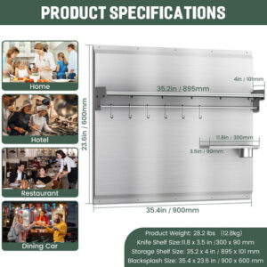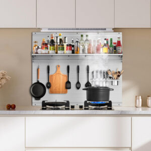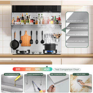 Introdução detalhada: A área de backsplash atrás do fogão suporta o peso das atividades culinárias diárias. É por isso que é importante que seu backsplash tenha toda a altura e largura, feito de materiais duráveis e tenha uma superfície fácil de limpar. Este backsplash de aço inoxidável com prateleira tem uma altura de prateleira padrão de 24 polegadas de altura e uma largura de 35,4 polegadas. Você pode montá-lo diretamente acima do alcance e ele pode se misturar perfeitamente com a borda inferior do capô para uma aparência elegante e coerente. A instalação é simples com este backsplash de metal. Tudo o que você precisa fazer é traçar os orifícios de montagem, perfurar previamente a parede e, em seguida, instalar a chapa. Sobre este item: Enviado com revestimento protetor no lado limpo. Remova depois de instalado. Cor: prata Forma: retangular Tipo de acabamento: polido Tamanho de medição: 35,4 “x 24" Tipo de montagem Material de montagem na parede: aço inoxidável 430, seguro para cozinha e fácil de limpar – Metal Backsplash: fogão de aço inoxidável com prateleira converte espaço de parede em espaço de armazenamento eficiente e prático. Nosso backsplash de forno se encaixa perfeitamente no exaustor e no fogão, pode manter as paredes da cozinha limpas com eficácia. Material de alta qualidade: feito de aço inoxidável 430 com um elegante acabamento escovado, este revestimento de fogão em aço inoxidável é resistente. Isso protege o respingo da parede atrás do fogão, sua superfície de cozimento – Backsplash for Kitchen: as dimensões do backsplash de aço inoxidável atrás do fogão são 35,4 “L x 24" W. Este backsplash de fogão com prateleira e 5 ganchos para guardar seus temperos e utensílios de cozinha. Mantém seu espaço elegante e organizado – Atualize o Backsplash: a estrutura triangular estável permite que o painel traseiro do fogão suporte um peso de cerca de 66 libras. O Backsplash para fogão vem com protetores laterais adicionais para evitar que o tempero caia e oferece um porta-facas para facas – Fácil montagem: nosso backsplash de aço inoxidável para fogão vem com acessórios completos e orifícios pré-perfurados. Em apenas alguns minutos, você pode configurá-lo prateleira de especiarias de cozinha de qualidade. Qualquer pessoa que adore manter o estilo elegante e moderno apreciará esta gama backsplash.