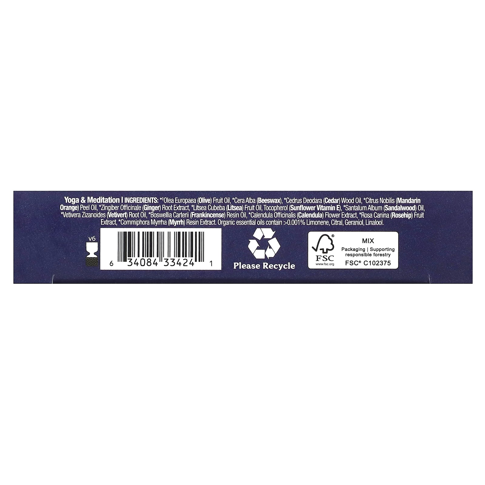 Ioga e Meditação: * ♦óleo da fruta de Olea europaea (azeitona), *cera alba (cera de abelha), *óleo de madeira de Cedrus deodara (cedro), *óleo da casca de Citrus nobilis (tangerina), *extrato da raiz de Zingiber officinale (gengibre), *óleo da fruta de Litsea cubeba (litsea), tocoferol (vitamina E de girassol), *óleo de Santalum album (sândalo), *extrato da raiz de vetivera zizanoides (vetiver), *extrato da resina de Boswellia carterii (olíbano), *extrato da flor de Calendula officinalis (calêndula), *extrato da fruta de Rosa canina (rosa mosqueta), *extrato de resina de Commiphora myrrha (mirra). Óleos essenciais orgânicos contêm & gt;0,001% de limoneno, citral, geraniol, linalol.