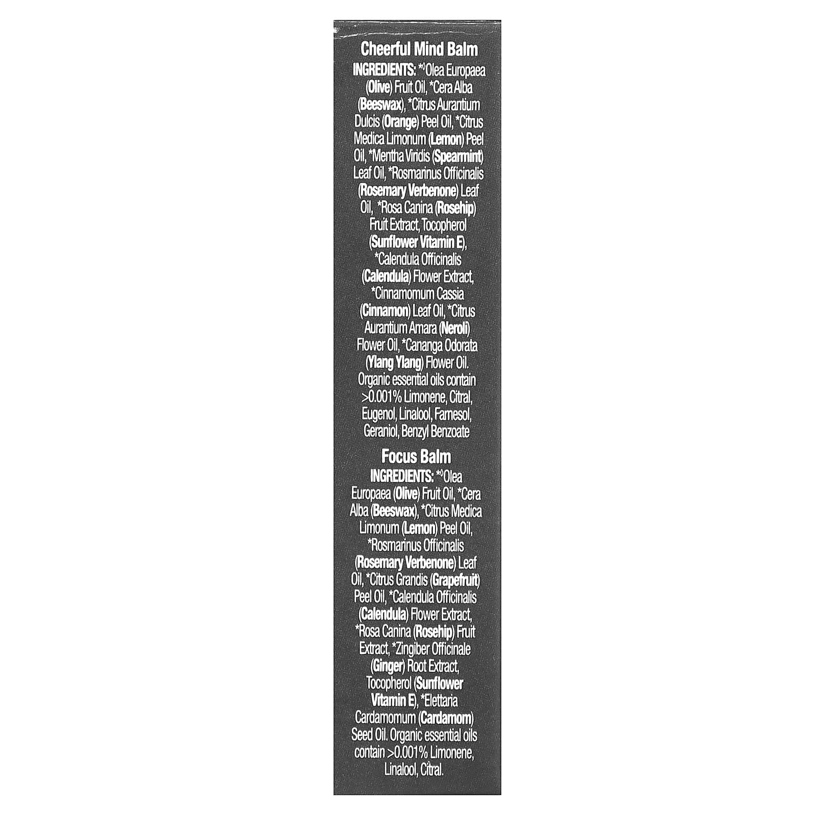 Bálsamo para Foco: * ♦óleo da fruta de Olea europaea (azeitona), *cera alba (cera de abelha), *óleo da casa de Citrus medica limonum (limão), *óleo da folha de Rosmarinus officinalis (alecrim verbenona), *óleo da casca de Citrus grandis (toranja), *extrato da flor de Calendula officinalis (calêndula), *extrato da fruta de Rosa canina (rosa mosqueta), *extrato da raiz de Zingiber officinale (gengibre), tocoferol (vitamina E de girassol), *óleo da semente de Elettaria cardamomum (cardamomo) Óleos essenciais orgânicos contêm & gt;0,001% de limoneno, linalol, farnesol, citral.