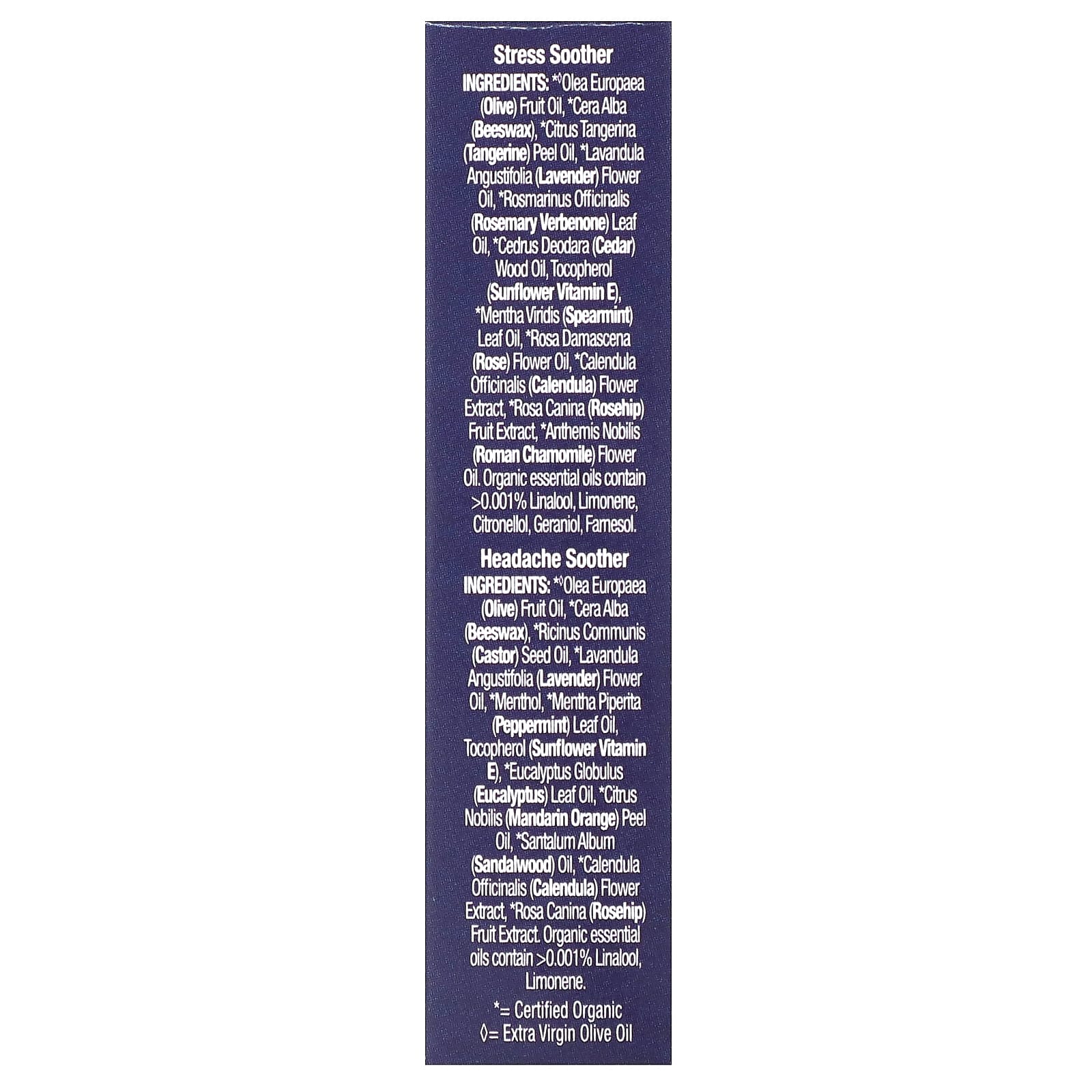 Amenizador de Dor de Cabeça: * ♦óleo da fruta de Olea europaea (azeitona), *cera alba (cera de abelha), *óleo da semente de Ricinus communis (rícino), * óleo da flor Lavandula angustifolia (lavanda), *mentol, * óleo da folha de Mentha piperita (hortelã-pimenta), tocoferol (vitamina E de girassol), *óleo da folha de Eucaliptus globulus (eucalipto), *óleo da casca de Citrus nobilis (tangerina), *óleo de Santalum album (sândalo), *extrato da flor de Calendula officinalis (calêndula), *extrato da fruta de Rosa canina (rosa mosqueta). Óleos essenciais orgânicos contêm & gt;0,001% de linalol, limoneno.