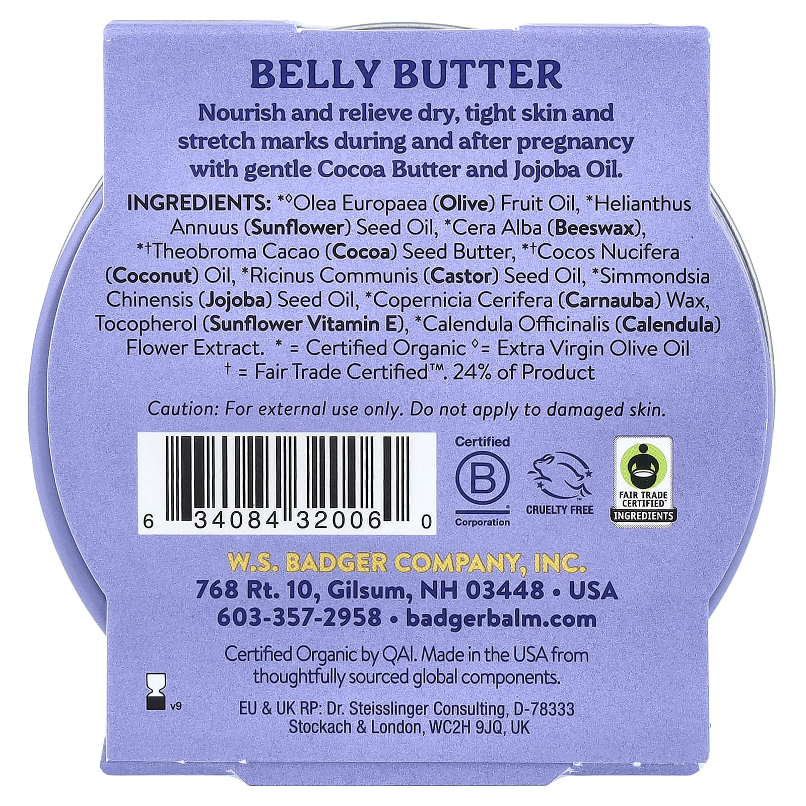 Nutra e alivia a pele seca e esticada, bem como as estrias durante e após a gravidez, com uma suave Manteiga de Cacau e Óleo de Jojoba.