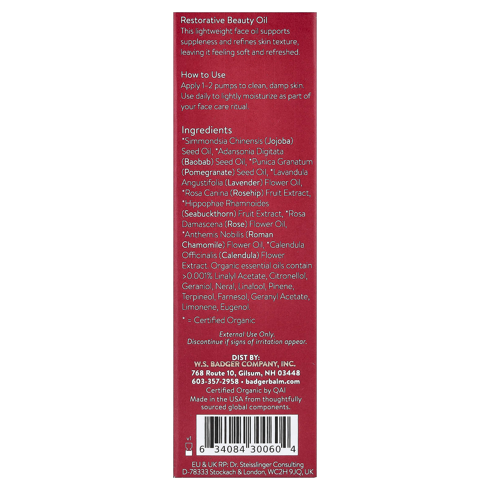 *Óleo da semente de Simmondsia chinensis (jojoba), *óleo da semente de Adansonia digitata (baobá), *óleo da semente de Punica granatum (romã), *óleo da flor Lavandula angustifolia (lavanda), *extrato da fruta de Rosa canina (rosa mosqueta), *extrato da fruta de Hippophae rhamnoides (espinheiro marítimo), *óleo da flor de Rosa damascena (rosa), *óleo da flor de Anthemis nobilis (camomila romana), *extrato da flor de Calendula officinalis (calêndula). Óleos essenciais orgânicos contêm >0,001% de acetato de linalilo, citronelol, geraniol, neral, linalol, pineno, terpineol, farnesol, acetato de geranilo, limoneno, eugenol.