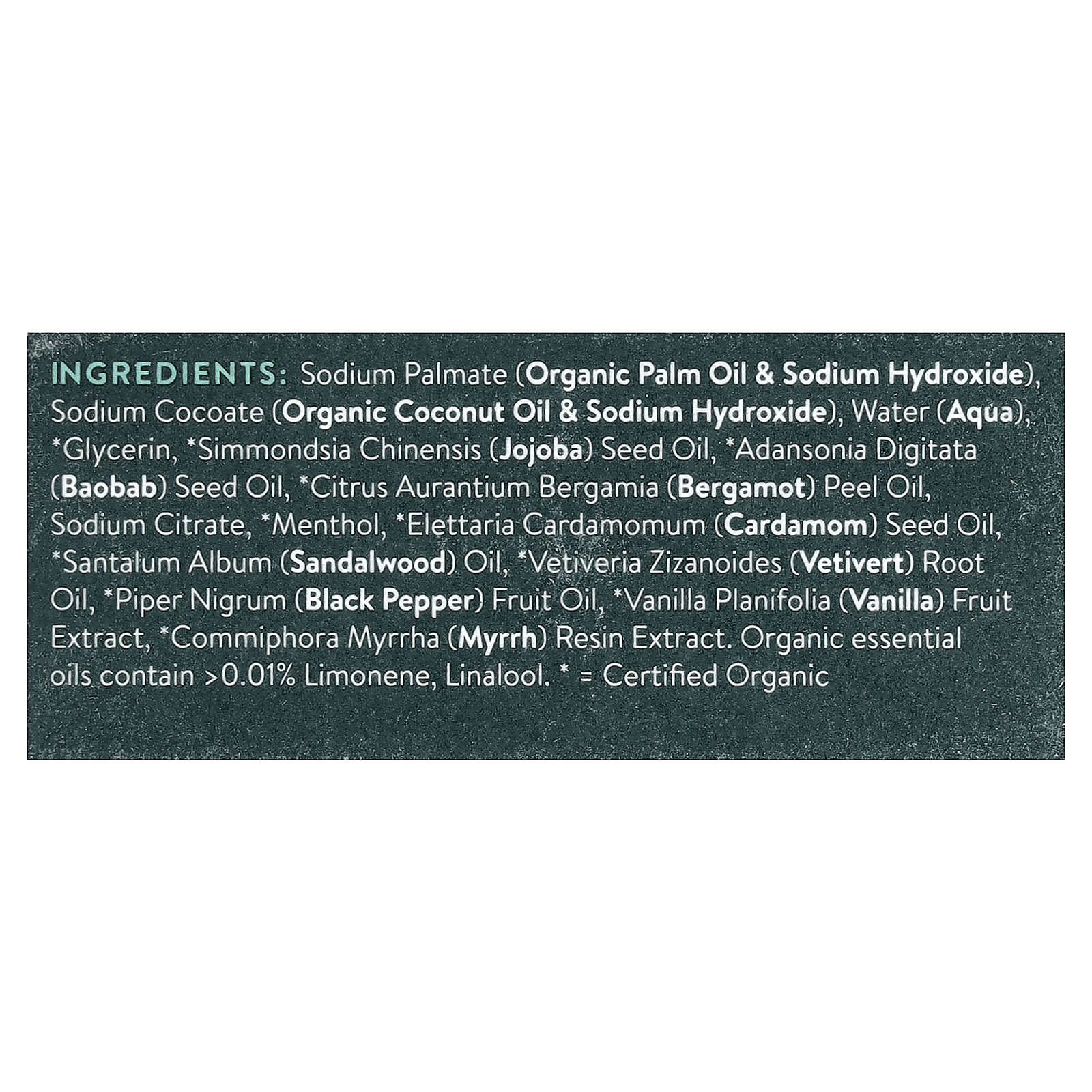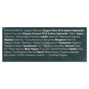 Palmate de sódio (óleo de palma orgânica e hidróxido de sódio), sodium cocoate (óleo de coco orgânico e hidróxido de sódio), água (aqua), glicerina, *óleo da semente de Simmondsia chinensis (jojoba), *óleo da semente de Adansonia digitata (baobá), *óleo da casca de Citrus aurantium bergamia (bergamota), citrato de sódio, *mentol, *óleo da semente de Elettaria cardamomum (cardamomo), óleo de Santalum album (sândalo), *óleo da raiz de Vetiveria zizanoides (vetivert), *óleo da fruta de Piper nigrum (pimenta-do-reino), *extrato da fruta de Vanilla planifolia (baunilha), *extrato da resina de Commiphora myrrha (mirra). óleos essenciais orgânicos contêm > 0,01% de limoneno, linalol.