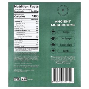 Xarope de tapioca, proteína de arroz integral, amêndoas, tâmaras, gotas de chocolate (açúcar de cana, licor de chocolate, manteiga de cacau, baunilha em pó), cacau em pó, chocolate não adoçado, proteína de ervilha, farinha de arroz, sabor natural, glicerina vegetal, flocos de sorgo, mistura de cogumelos em pó (juba-de-leão, reishi, cordyceps, chaga), sal marinho.