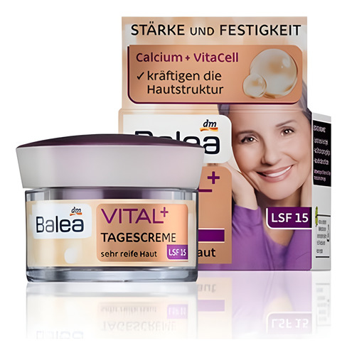 creme de dia Balea Balea Vital+, especialmente formulado para as necessidades específicas da pele muito madura. O uso diário ajuda a aumentar a densidade, força e elasticidade da pele. Graças ao seu complexo de cálcio, Vitacell e peptídeos, ele fortalece a estrutura da pele, melhora a firmeza dos contornos faciais e fornece hidratação duradoura com pantenol e óleo de amaranto de alta qualidade. Ele também tem SPF 15 para proteger a pele do envelhecimento prematuro induzido pela luz. Testado dermatologicamente e livre de crueldade. Produto vegano, fabricado na Alemanha.
