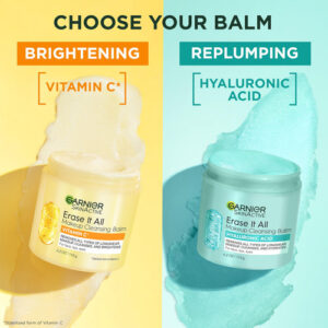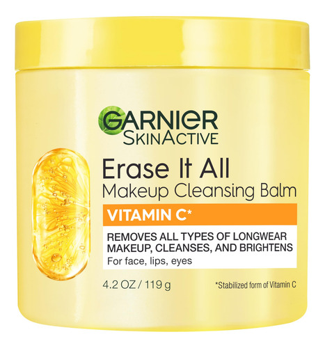 Bálsamo de limpeza de maquiagem Garnier Erase It All com vitamina C, limpador facial iluminador e removedor de maquiagem, 4,2 onças — Apague tudo: este bálsamo de limpeza foi formulado com vitamina C para limpar e remover suavemente todos os tipos de maquiagem de longa duração: olhos, lábios, rosto e resíduos de protetor solar. Use como limpador facial matinal e removedor de maquiagem à noite – Limpa com hidratação 24 horas: graças à sua fórmula alimentada por vitamina C*, nosso bálsamo de limpeza e removedor de maquiagem deixa a pele com uma aparência mais brilhante instantaneamente e com o tempo. Este limpador facial deixa a pele hidratada por 24 horas com acabamento não oleoso – Para melhor uso: para remover a maquiagem e limpar a pele, massageie uma quantidade generosa de bálsamo de limpeza na pele seca usando movimentos circulares. Adicione água para criar uma espuma leitosa e enxágue com água morna – Garnier se compromete com uma beleza mais ecológica: Garnier é aprovada pela Cruelty Free International. Este bálsamo removedor de maquiagem é livre de fragrâncias, sulfatos e silicones e não é comedogênico e não obstrui os poros. A Garnier oferece uma variedade de produtos para suas necessidades de cuidados com o cabelo e a pele, desde xampus, produtos para colorir e modelar até fórmulas que limpam, hidratam e ajudam a proteger sua pele