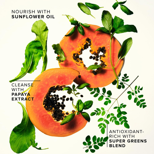 – Ingredientes Farm to Face – Um limpador duplo que é mais verde, limpo e melhor do que toalhetes de maquiagem, alimentado por ceras vegetais + uma mistura superverde cultivada na fazenda de moringa reciclada, santa manjericão e rúcula. –