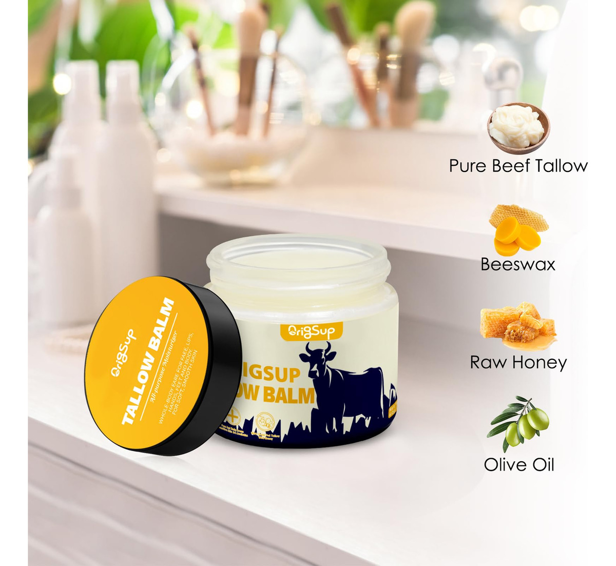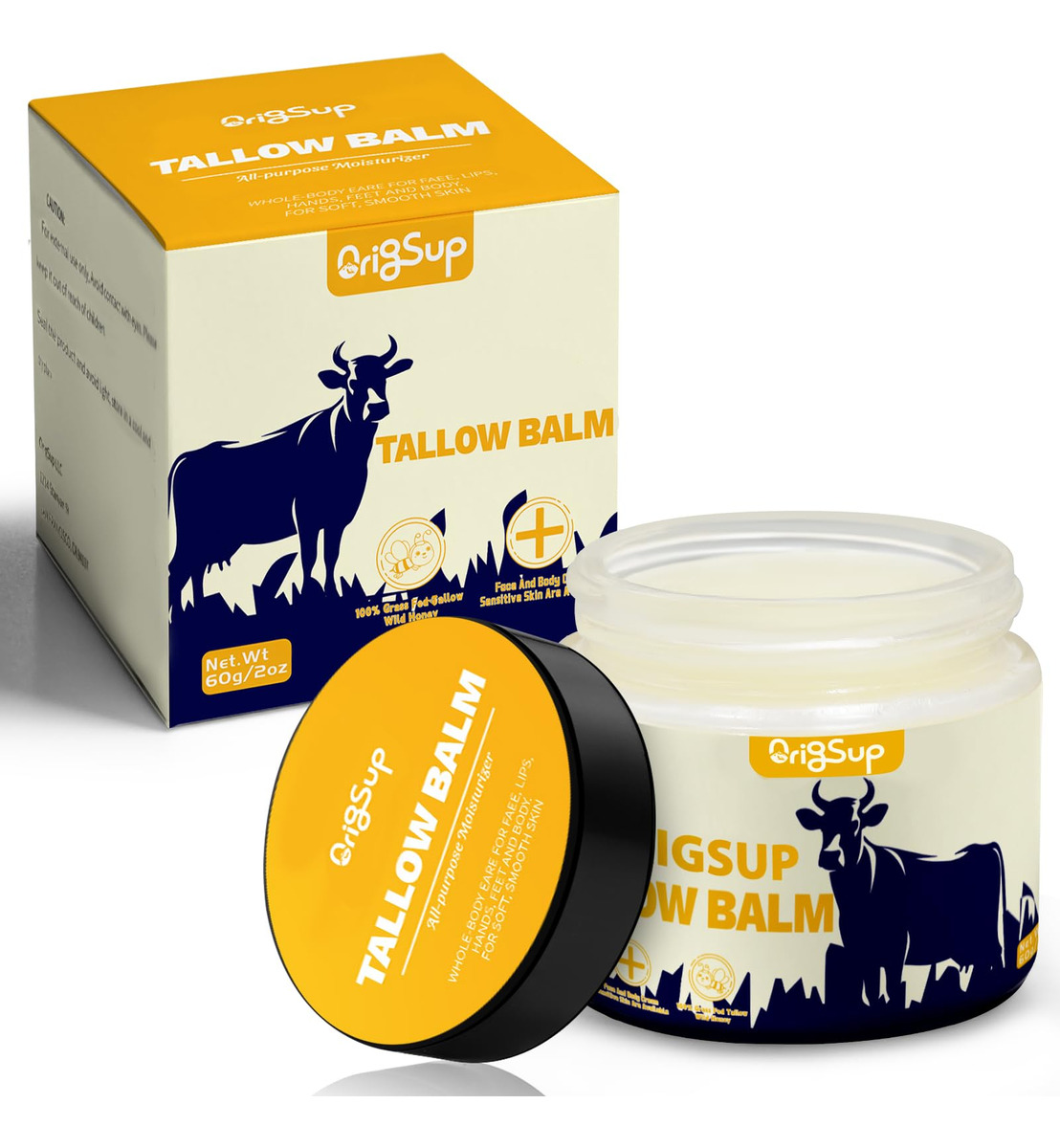 Apresentando o Beef Sallow Balm da ORIGSUP, um hidratante de sebo bovino que oferece a melhor hidratação para sua pele. Este bálsamo de sebo é feito de sebo alimentado com capim e é perfeito para quem tem eczema, pele rachada, seca, com coceira ou irritada. Este bálsamo de sebo é criado com uma mistura de cera de abelha orgânica e mel cru, o que lhe confere uma qualidade multiuso que pode ser usada para combater a pele seca em qualquer parte do corpo. Você vai adorar como esse óleo corporal hidratante alivia a pele seca e danificada, proporcionando um alívio natural para os sintomas de problemas de pele, como eczema. A combinação única de sebo alimentado com capim e óleos essenciais se une para proporcionar alívio à pele sensível, ao mesmo tempo que suaviza e hidrata a pele. Com este bálsamo de sebo, sua pele certamente sentirá os benefícios de um hidratante totalmente natural, livre de produtos químicos agressivos ou ingredientes sintéticos. – Bálsamo de sebo multiuso: uma solução natural para pele seca, rachada e com coceira que fornece cuidados e hidratação essenciais, deixando a pele nutrida e revitalizada. – Hidratante de sebo bovino alimentado com capim: uma pomada luxuosa enriquecida com óleos essenciais e mel cru para uma vida holística bem-estar, proporcionando brilho natural e pureza à sua pele. – Delicie-se com uma pele sedosa e macia: nosso bálsamo facial e corporal foi projetado para deixe sua pele mais lisa e forte. Feito sem nenhum preenchimento adicional, nosso produto para pele de sebo requer apenas uma pequena quantidade a cada aplicação. – Nutra sua pele com a natureza: formulado com os ingredientes naturais mais puros, nosso creme corporal de sebo batido fornece nutrição essencial, enriquecendo sua pele com a bondade dos componentes orgânicos e naturais. Nosso bálsamo de sebo é livre de fragrâncias sintéticas, parabenos e aditivos artificiais. – Óleo corporal: O bálsamo de sebo bovino fornece um óleo corporal exclusivo e totalmente natural que hidrata e acalma a pele seca e propensa ao eczema, deixando-a nutrida e revitalizada. Nosso bálsamo de sebo é feito de sebo bovino alimentado com capim para a pele, oferecendo o máximo benefício à sua pele.