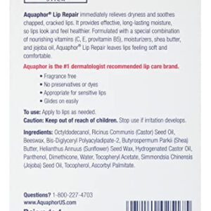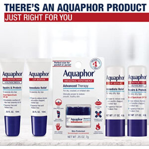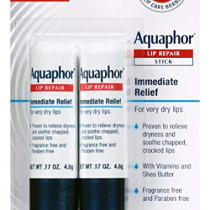 Encontre hidratação duradoura e proteja seus lábios do sol com o Aquaphor Lip Repair Stick da marca #1 de cuidados labiais recomendada por dermatologistas. Esta fórmula hidratante de protetor solar labial, com FPS 30 de amplo espectro, oferece proteção UVA/UVB e contém vitaminas nutritivas e manteiga de karité. Especialmente formulado para lábios sensíveis e muito secos, o Aquaphor Lip Repair Stick com SPF 30 alivia imediatamente o ressecamento e acalma, para que os lábios pareçam e se sintam mais saudáveis. Esta fórmula de protetor labial sela a umidade e proporciona um alívio eficaz e duradouro, deixando os lábios macios e suaves. O bastão reparador labial Aquaphor com SPF 30 desliza facilmente e hidrata os lábios, por isso também é ótimo para uso em condições secas, frias ou ventosas. O Aquaphor Lip Repair Stick não contém fragrâncias nem parabenos. Aplique o Aquaphor Lip Repair Stick generosamente nos lábios secos sempre que necessário e, para protetor solar, use conforme as instruções. Este pacote múltiplo inclui dois bastões reparadores labiais Aquaphor de 0,17 onças e dois bastões Aquaphor Repair & Protect SPF 30 de 0,17 onças.